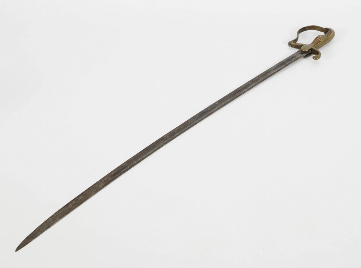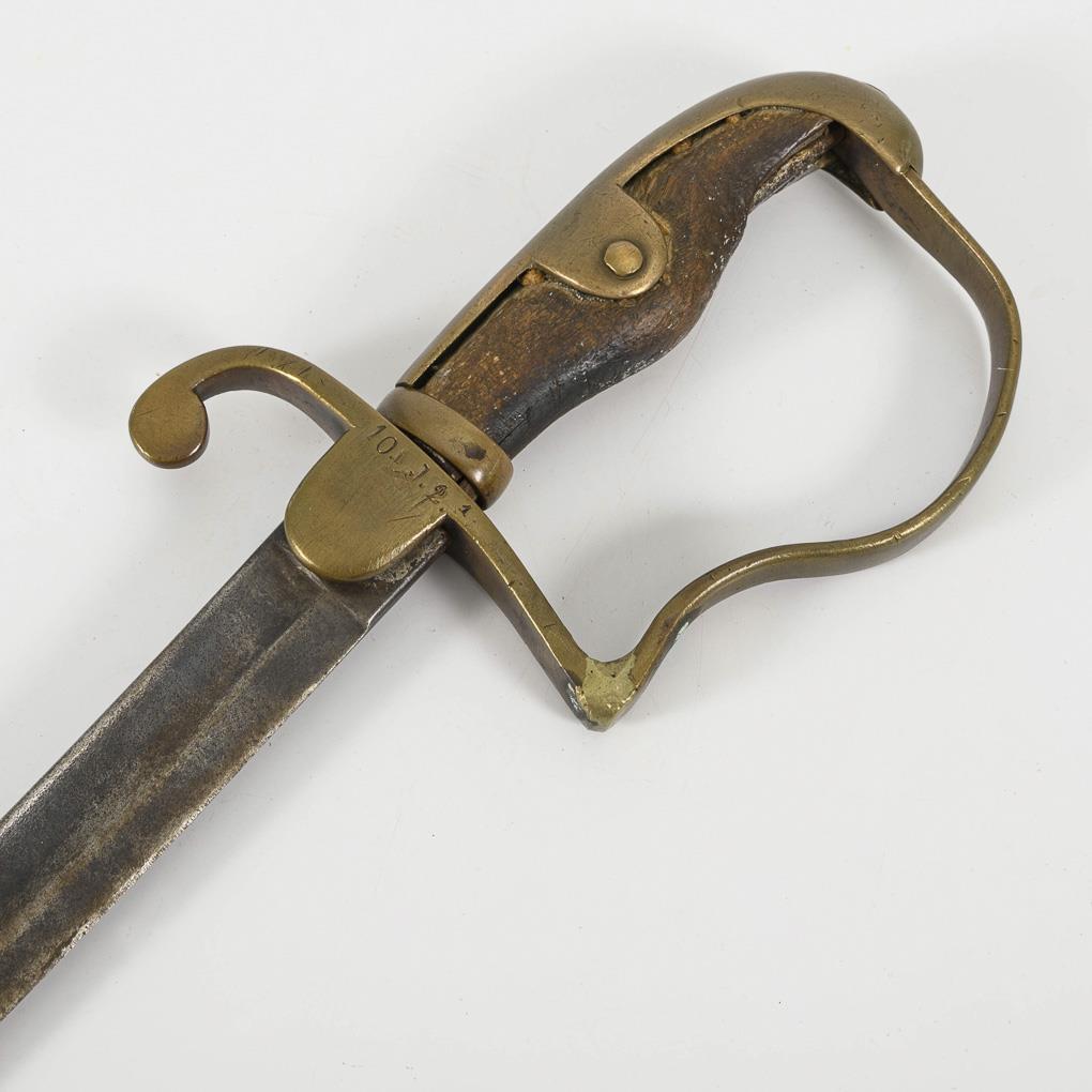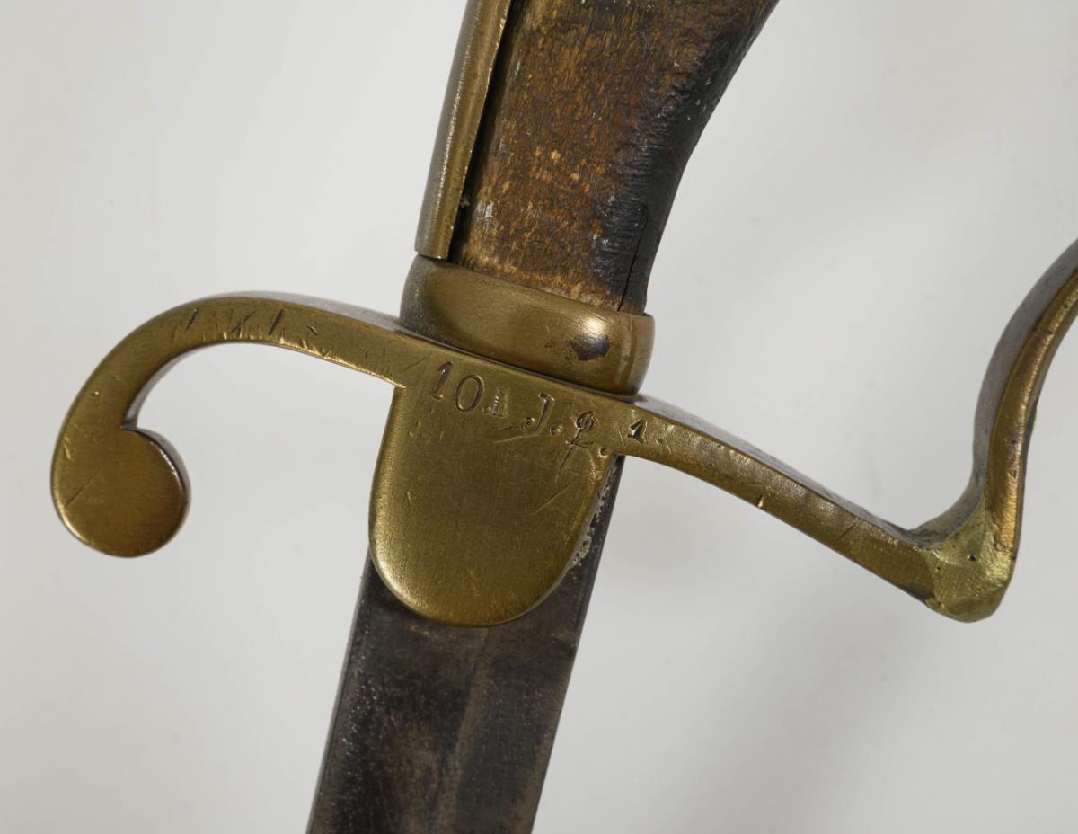 Einschneidig, gekrümmte Klinge mit Spitze in der Rückenlinie und Hohlschliff bis kurz vor die Spitze. Einfaches Bügelgefäß mit Holzgriff. Gepunzt "10.J.2. 1". Holzgriff mit Fehlstellen und Altersspuren.