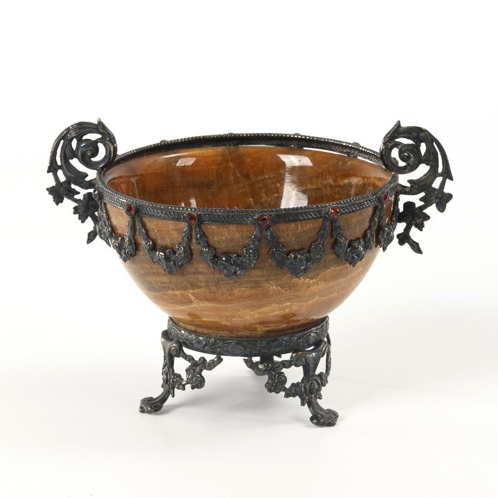 Brauner Achat, Metall versilbert, rote Steine. 8,5 x 9 cm (ohne Griffe).