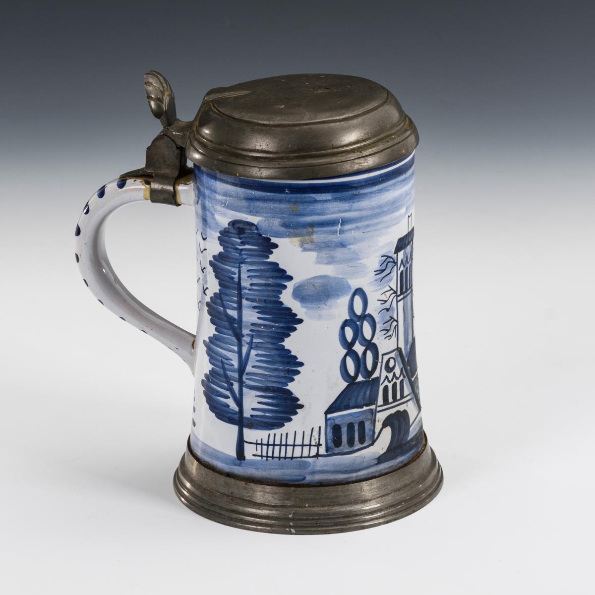 Walzenkrug mit Kirchenarchitektur zwischen hohen Bäumen, strichverzierter Bandhenkel, gepunzter Zinndeckel mit Muscheldrücker, Zinnstandring. Leichte Alters- und Gebrauchsspuren.