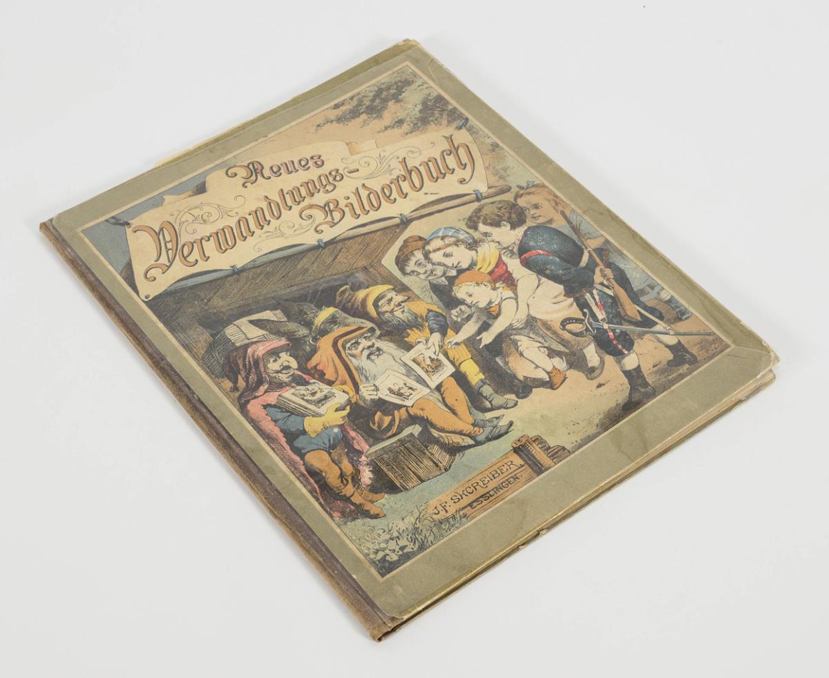 "Zur Unterhaltung und Belustigung der heiteren Jugend mit sechs Doppelbildern in lithograph. Farbendruck". Steinzeichnungen von W. v. Breitschwert. Verlag von J.F. Schreiber, Eßlingen (1875), 2. Auflage. Jedes Bild als klappbares Doppelbild, welches die Folgen der vorhergehenden Tat zeigt. Titelblatt und Block lose, stärkere Nutzungsspuren.