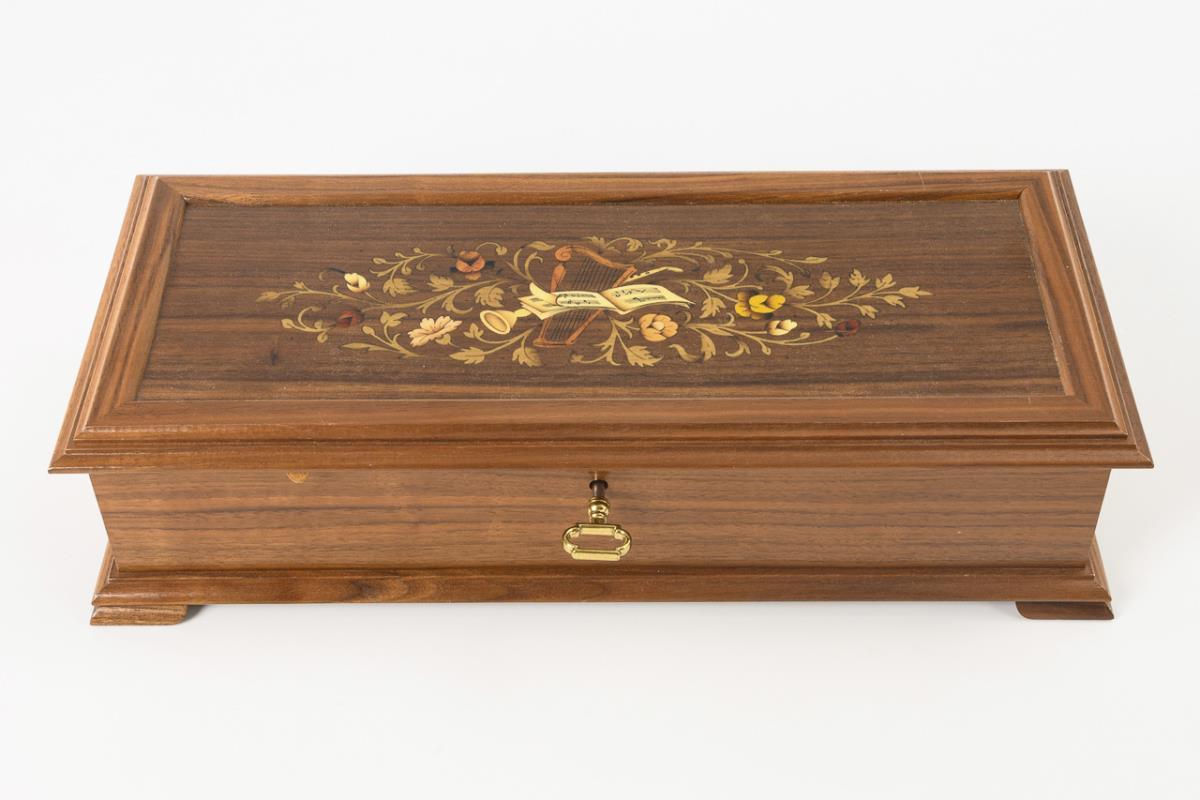 Quaderkasten-Spieluhr, auf dem Scharnierdeckel feine Marketerie mit Instrumenten und Blattranken. Deckeletikett zur limitierten Auflage mit Liedaufzählung (Beethoven 5., 6. und 9. Symphonie) und 3 Unterschriften. Unter der Verglasung Walzenspielwerk mit 2 Zungenkämmen und Liedanzeige. Neben dem Werk 2 Stellhebel. Spielt mit schönem Klang (etwas langsam).