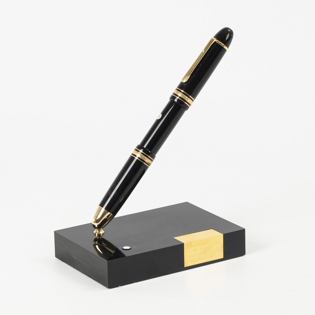 Schwarzer Kunststoff, Goldfeder. L Füller 15 cm, Ständer 9 x 12 x 8 cm.