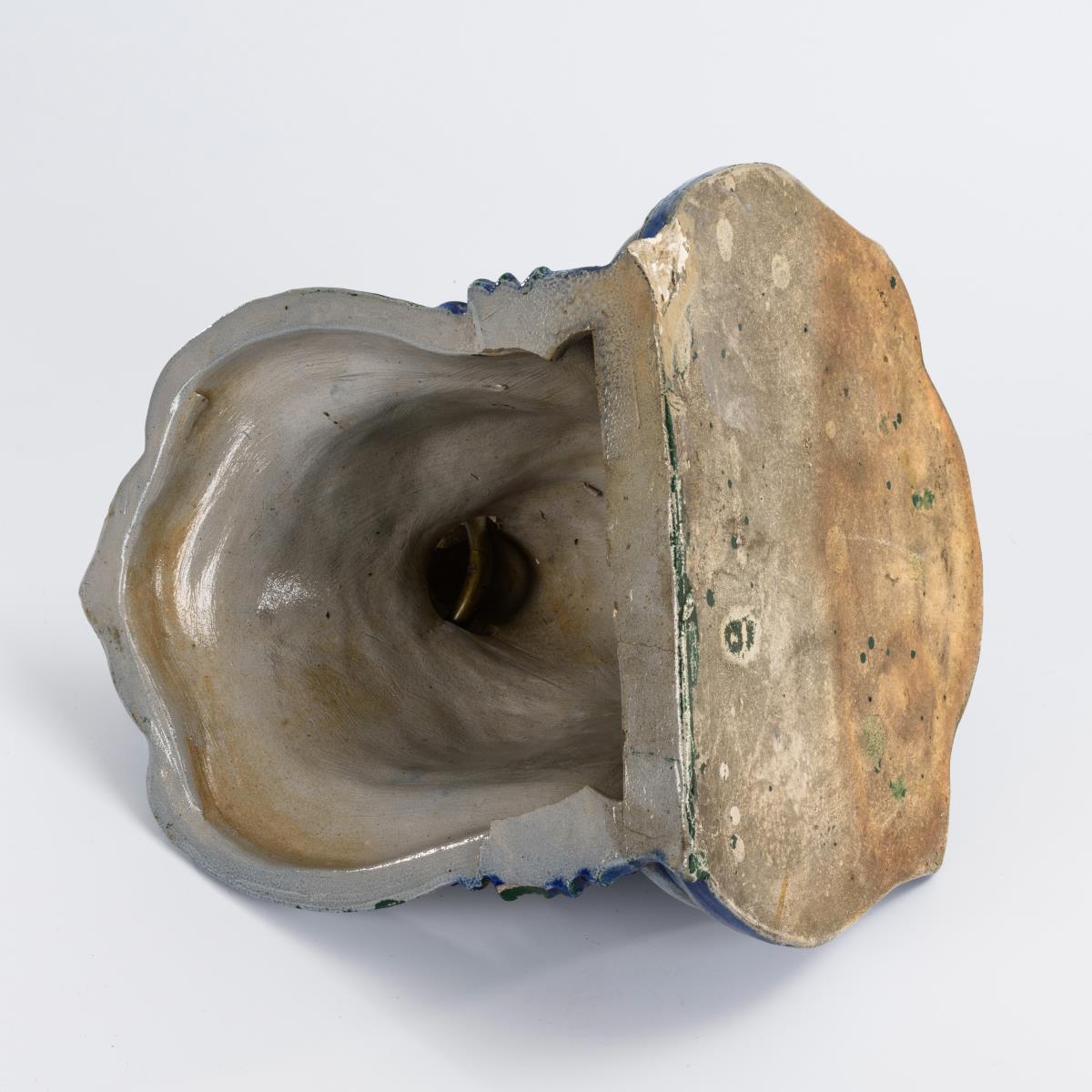 Geschweifte Konsole mit teilplastischem Löwenkopf und Bronzering. Partiell bestoßen, feine Brandrisse.
