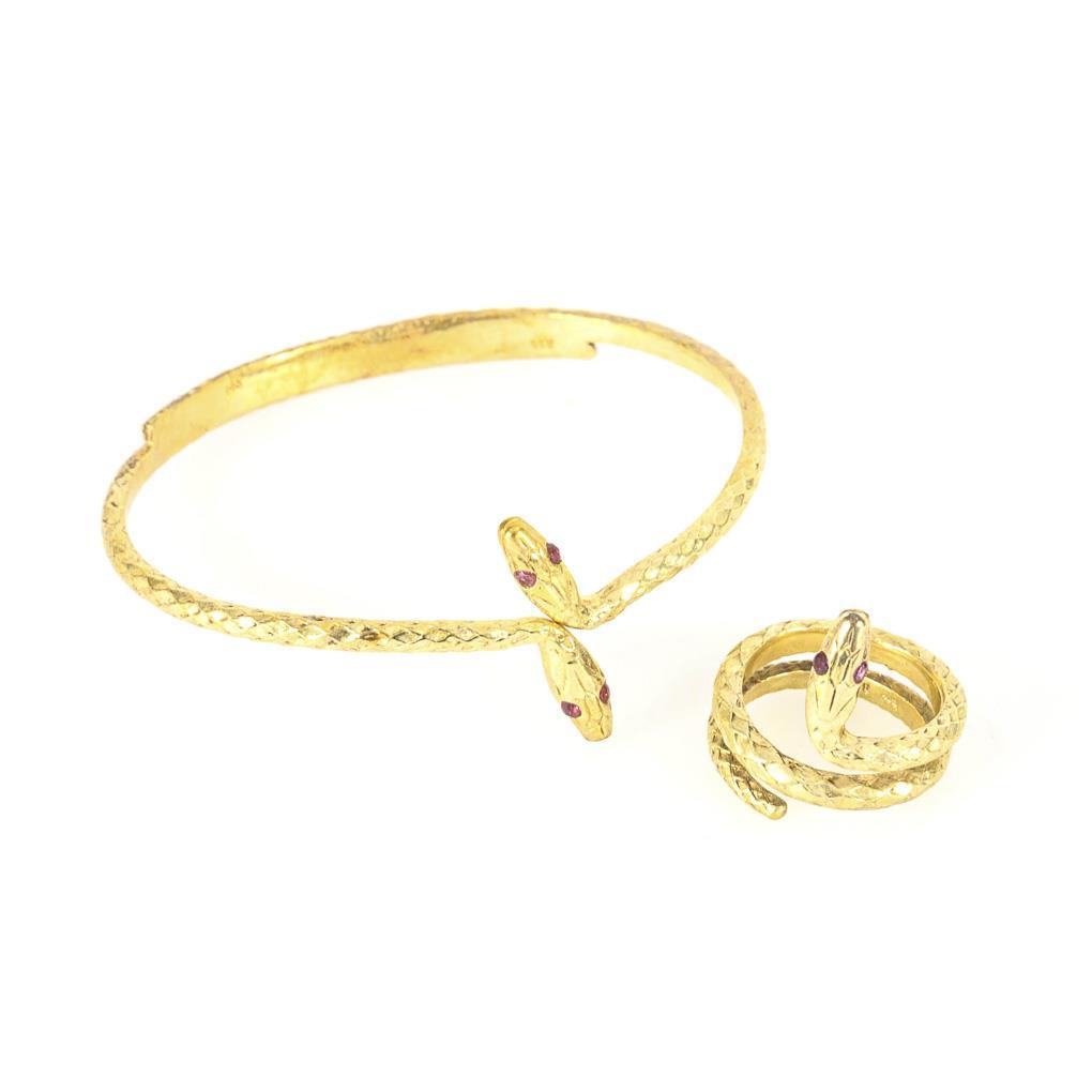 Offener, reliefierter Reif mit 2 Kopfenden und kleinen eingelassenen Rubinaugen. Dazu passender Ring. Mittlere Schiene.