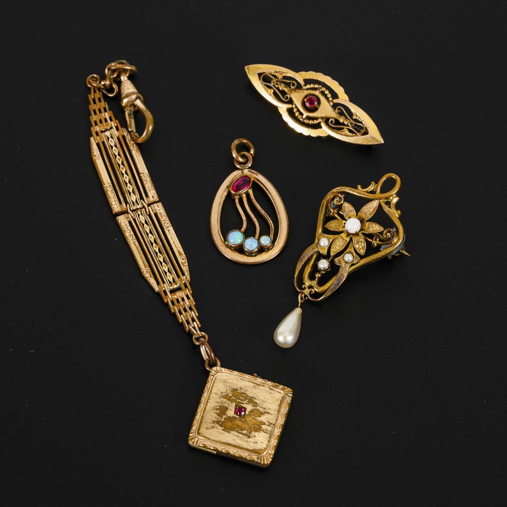 Châtelaine mit Medaillon (2 gerahmte Innenfächer), 2 Broschen und Anhänger mit Opalcabochons, Perlchen, Kunstperle und roten Imitationen. Karabiner, Hakenverschlüsse.