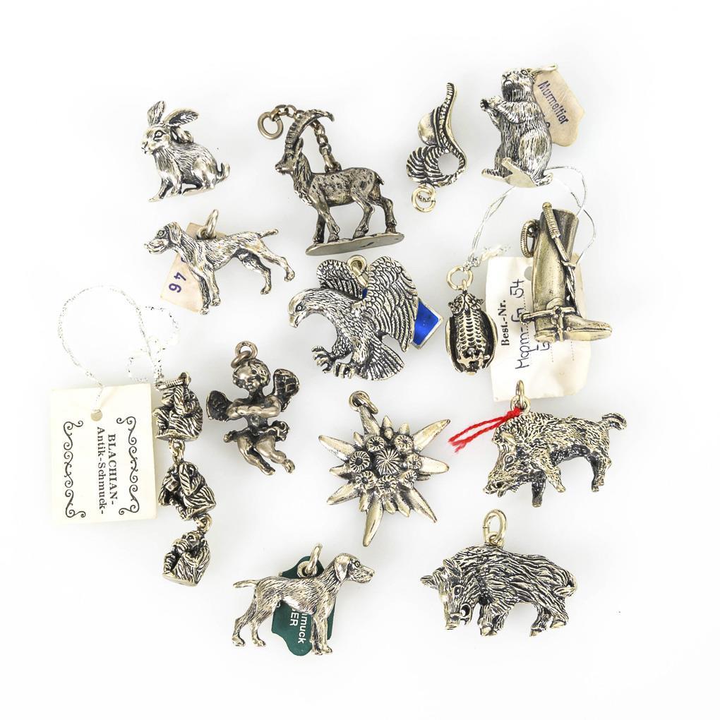 14 plastische Anhänger (u.a. Adler, Murmeltier, Jagdhund, Hase, Eule, 2 Wildschweine, die Drei Affen, Stiefel, Hut, Edelweiß, Engel) mit teilweise Originaletiketten.