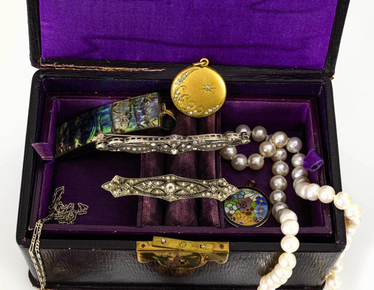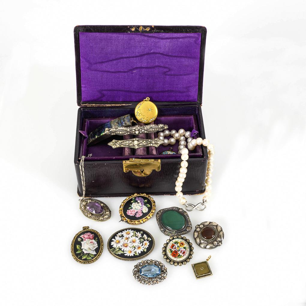Trachtenkette mit Herzanhänger, reliefierter Anhänger mit Amethyst? an Kette. Schnürkette mit Zuchtperlen an Karabinerschließe. 5 Anhänger (darunter 1 Medaillon mit Straßbesatz und 1 Innenrähmchen, 2 emaillierte Anhänger, 1x Pietra Dura, Pauamuschel-Einlage) und 8 Broschen (u.a. emailliert, Glasmosaik, 3 reliefierte Broschen mit Achaten und Imitation, 2x straßbesetzt. Kugelhaken. Kästchen mit Einsatz. Kästchen ohne Schlüssel, Deckel teils lose.