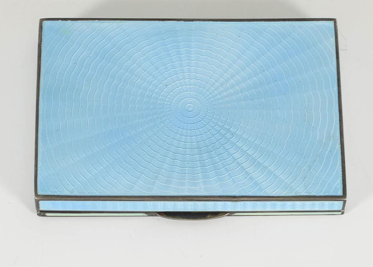 Flache, rechteckige Dose mit hellblauem Transluzidemail und Blütenkorb auf dem Deckel.