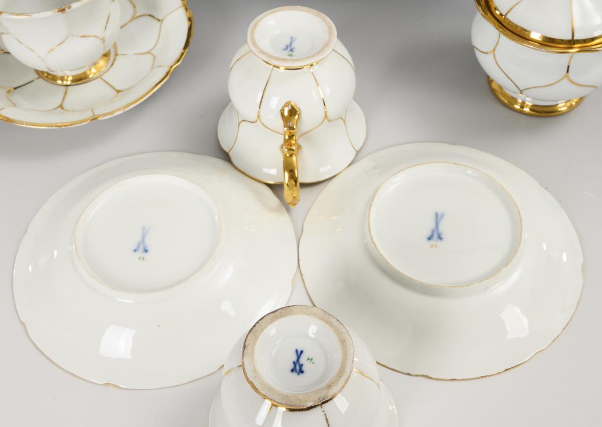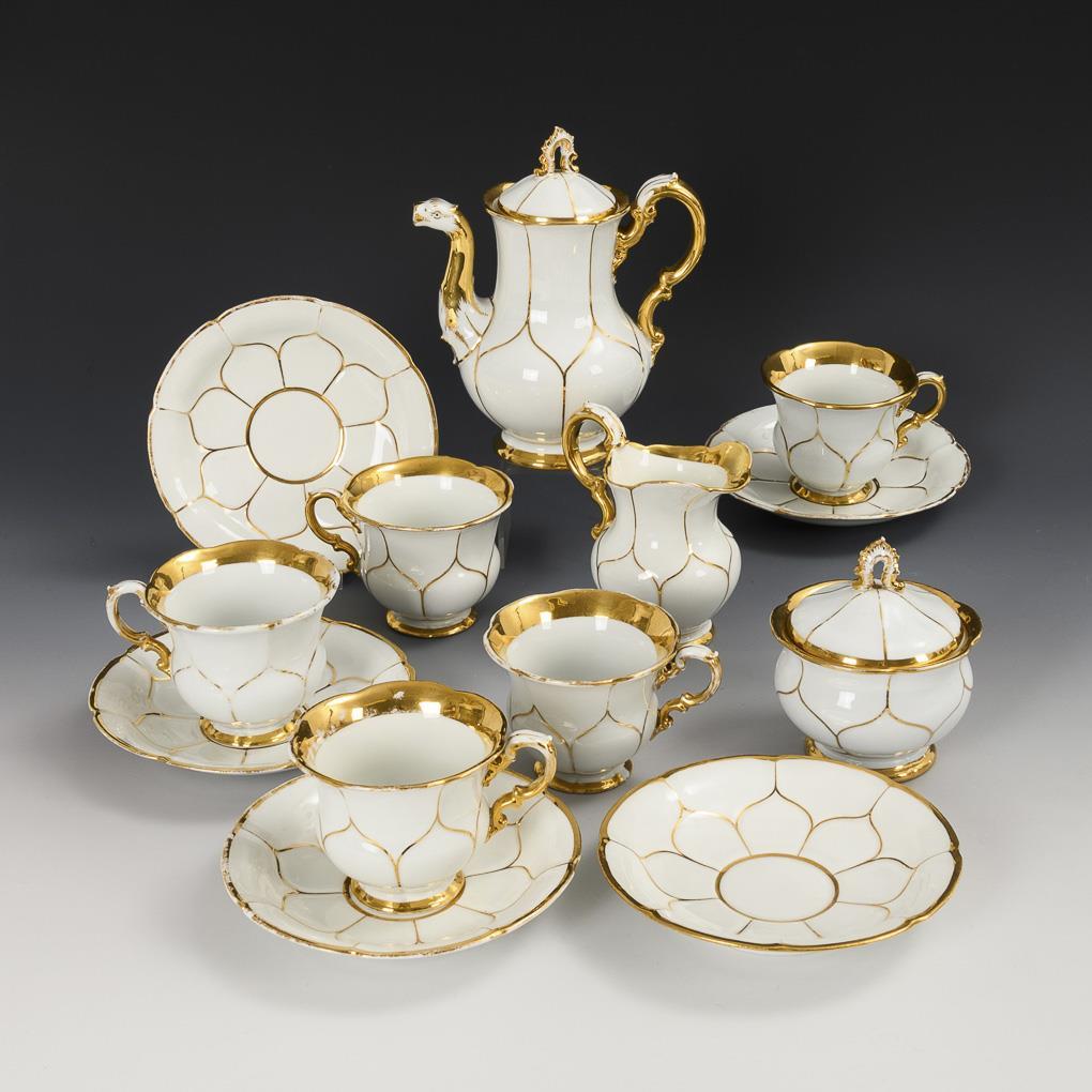13 Teile. Mokkakanne (H 18 cm), Milchkännchen, Zuckerdose, 5 Kaffeetassen und 5 Untertassen. Gold partiell berieben, Chip an 1 Tassenrand.