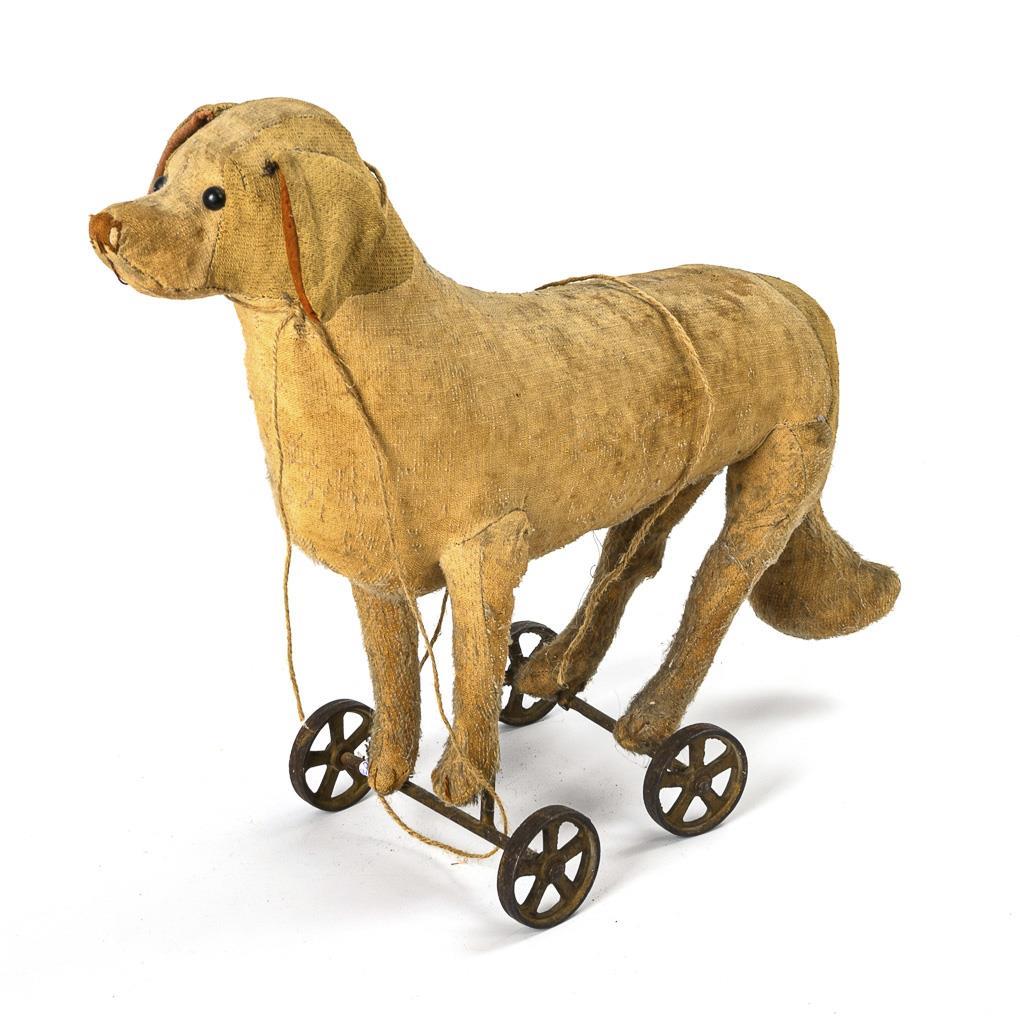 Weißer Steiff-Teddy (eventuell handelt es sich um einen Teddy Clown) mit dunkler Bestickung, Vorderpfoten mit Stoff übernäht, Stopfung locker, karierte Stoffschleife, Knopf mit langem "F", L 45 cm. / Hochwertiger Thüringer? Teddy mit sehr spitzer Schnauze, blond, Glasaugen, schwarze Bestickung, eine der Filzpfoten übernäht, L 49 cm. / Räderhund mit hochwertigem Gestell, Schuhknopfaugen, roten Filz-Innenohren, Nasengarnierung und 3 Krallen, verkahlte Fellflecken, 34 x 40 cm. Als Zugabe alte Kinder-Ziehharmonika, auf altem Etikett bezeichnet "Victorian Squeeze Box". Alle Tiere mit starken Altersspuren und Reparaturstellen, verkahlt.