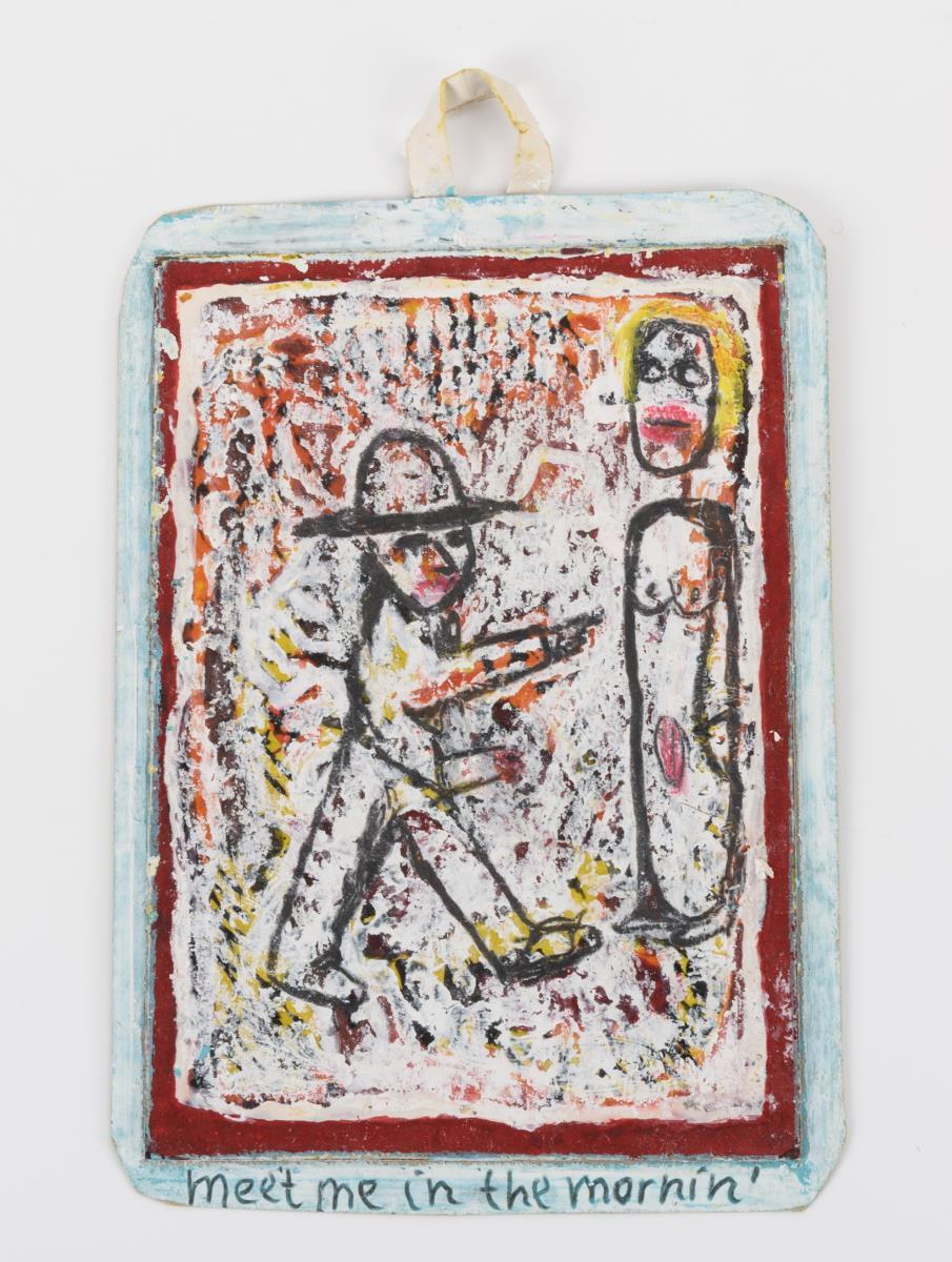 Männliche Figur, die mit einer Erektion auf eine Frau zuläuft.