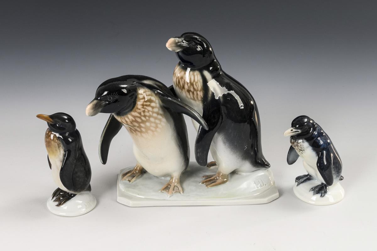 1x METZLER & ORTLOFF, 1935, Modell-Nr. 7549, monogrammiert "HD.": Pinguinpaar auf einer Eisscholle (H 13,5 cm). / 2x ROSENTHAL, 2. H. 20. Jh., Modell-Nr. 397 und 398, Entwurf um 1914 von Karl Himmelstoß (1872-1967): stehende Pinguine (H 7 und 8 cm).