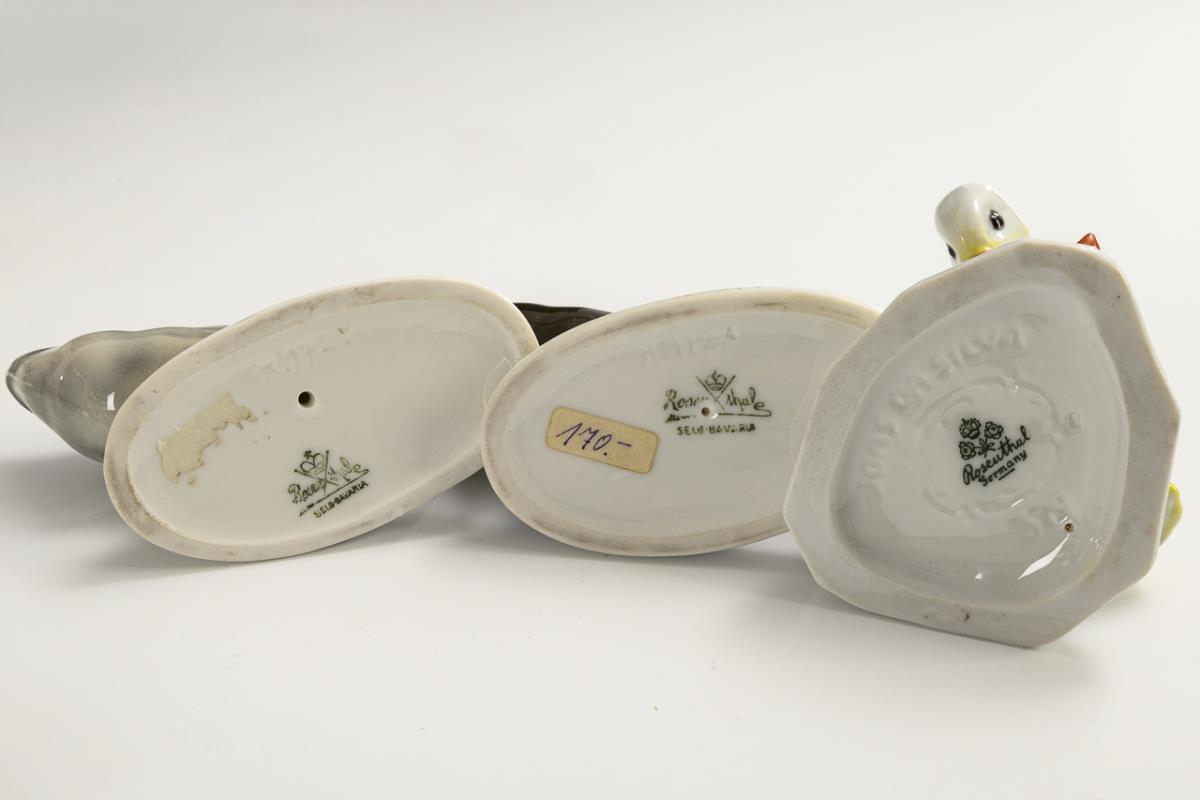 1x HEUBACH: zwei Pinguine auf einer Eisscholle (H 18 cm). / 6x ROSENTHAL: 3 ähnliche und 3 verschiedene kleine Entenfiguren (H 4,5-10,5 cm). / 1x NYMPHENBURG: sitzender kleiner Hase (H 6,5 cm).