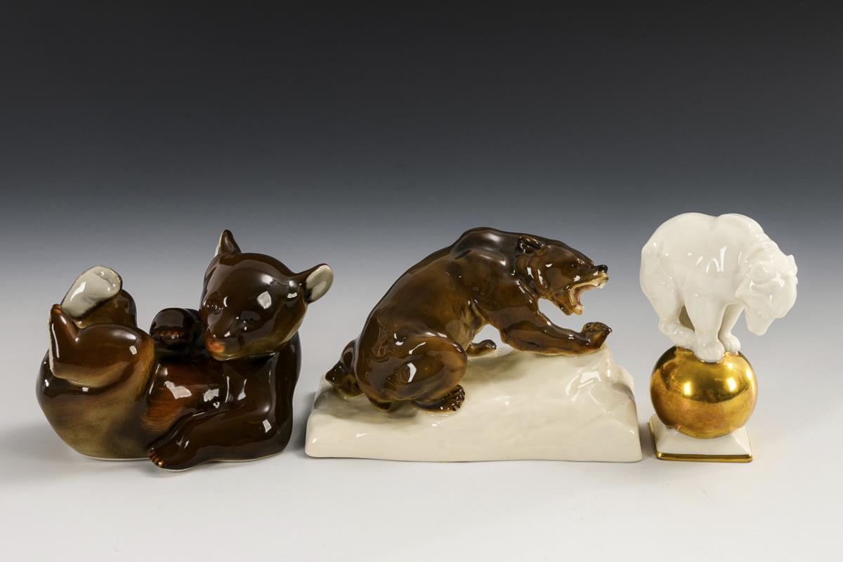 1x AELTESTE VOLKSTEDTER. ab ca. 1915: Braunbär auf einem Felssockel (H 9 cm). / 1x HUTSCHENREUTHER, ab 1955, Entwurf Karl Tutter (1883-1969), bezeichnet: Bärenjunges auf einer Goldkugel (H 9,5 cm). / 1x LOMONOSSOW, 2. H. 20. Jh.: auf dem Rücken liegender, junger Bär (L 13,5 cm).