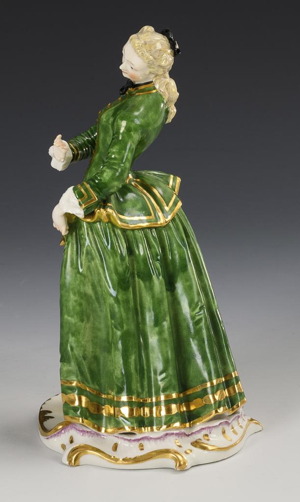 Dame auf einem Rocaillesockel, die linke Hand abwehrend erhoben. Bestoßung am Sockelrand.
