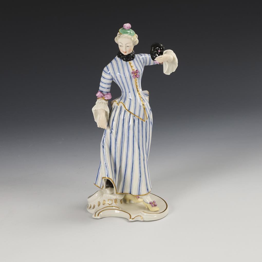 Auf einem Rocaillesockel stehende, eine Maske in der linken Hand haltende junge Frau.