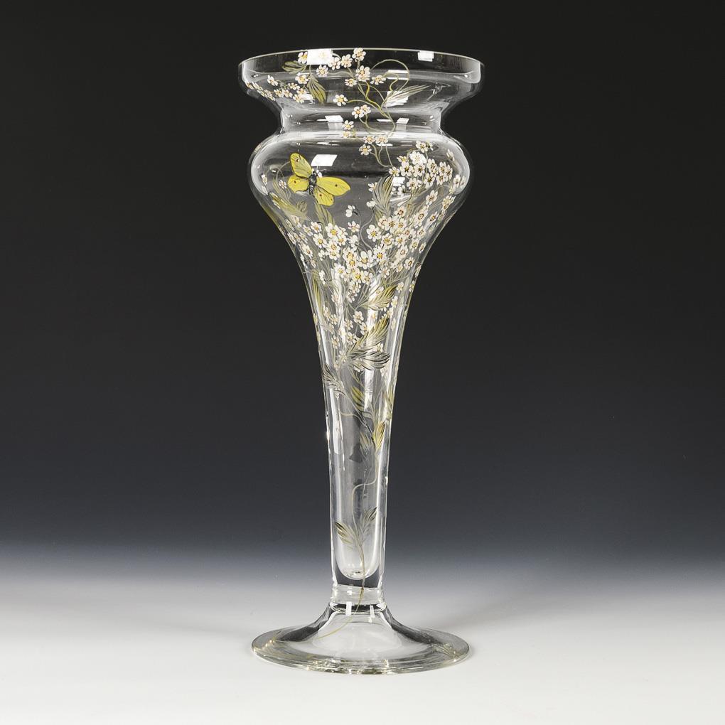Große Vase aus farblosem Glas mit polychrom emailgemalten Blütenstängeln mit Schmetterling. Minimale Bestoßung am Mündungsrand.