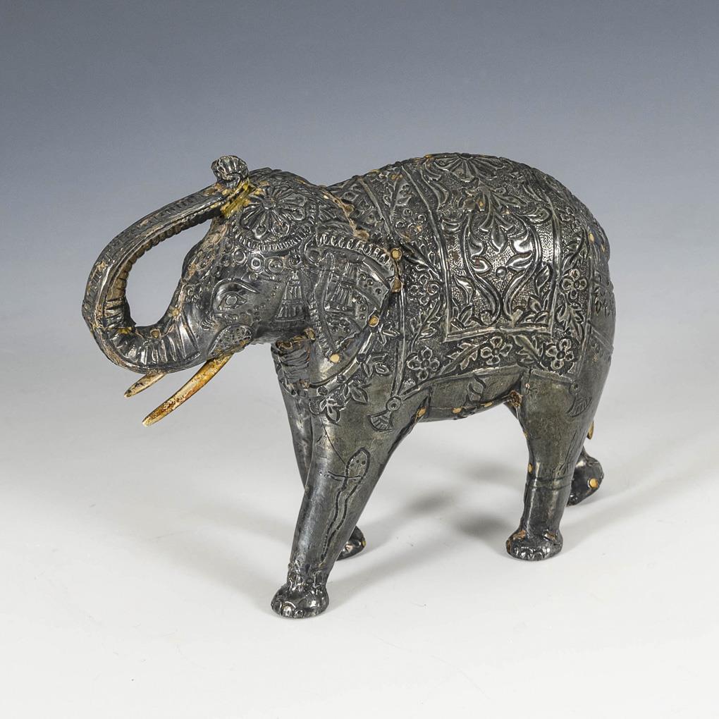 Tierfigur mit ornamental verziertem Silberblech-Beschlag. Silberblech am Rüssel etwas gelöst.