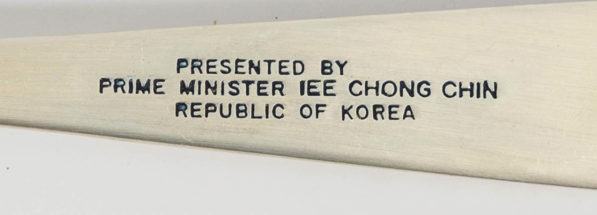 Botschaftsgeschenk mit Widmung auf den Rückseiten der Griffe "Presented by Prime Minister Chin, lee Chong, Republic of Korea".