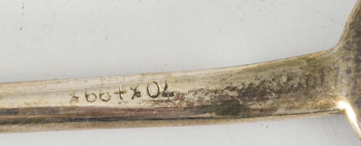 Kaffeelöffel mit farbig emaillierten Griffen. In dunkelbrauner Samtschatulle. Emaille mit Defekten.