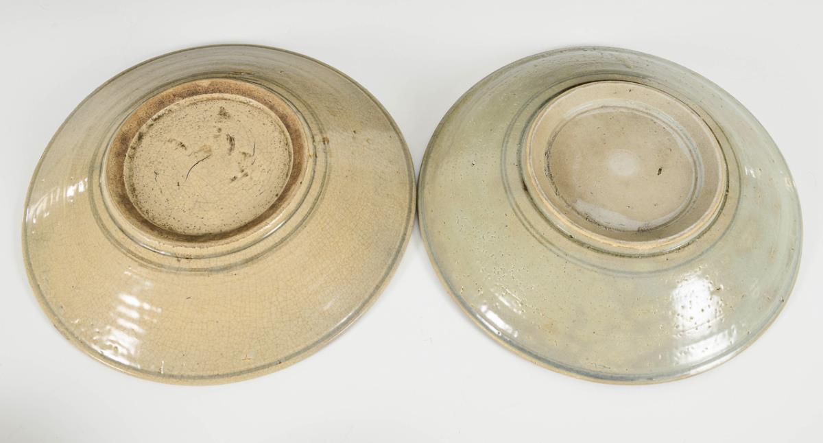 Alle mit Unterglasurblaumalerei. 2 kleine Kummen mit wildem Rankenmuster auf der Außenwandung. Eine Schale innen mit Einschlüssen. Ø 14 cm. / 2 größere, flache Schalen mit grauer Glasur. Dekor besteht aus geflochtenen Blumenkörben. Äußerer Rand des Spiegels unglasiert, einer mit Brandriss auf der Unterseite. Ø 26 cm.