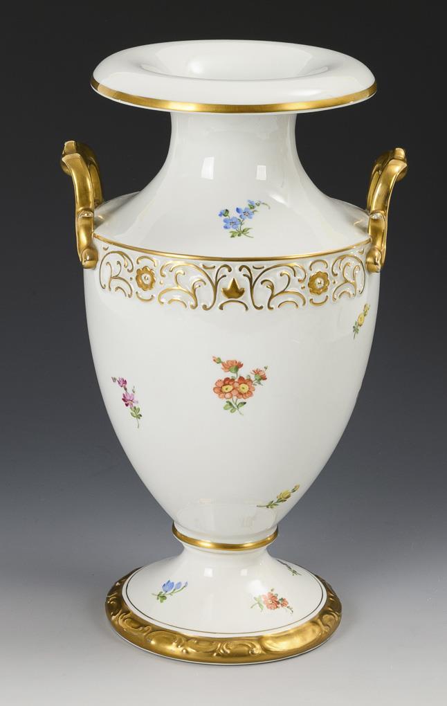 Halbovoider Korpus mit zwei Handhaben, Hals mit weit auslappendem Mündungsrand, Rundfuß. Schauseitig ein großes Blumenbukett mit Rose und Tulpe, verso Streublümchen.
