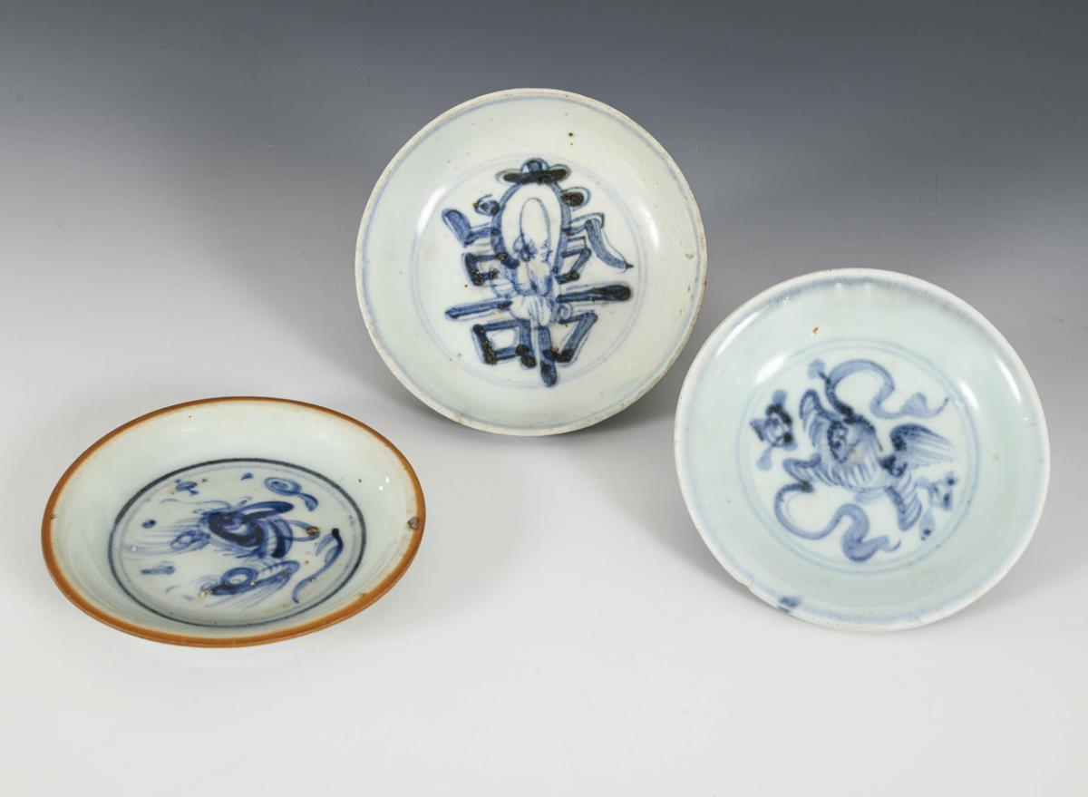 Chinesisches Porzellan als Export für die Philippinen, Swatow-Ware. 4 kleine Teller und ein Schüsselchen in Unterglasurblaumalerei, eines mit Schriftzeichen, sowie Fabelwesen und Blumenranken.