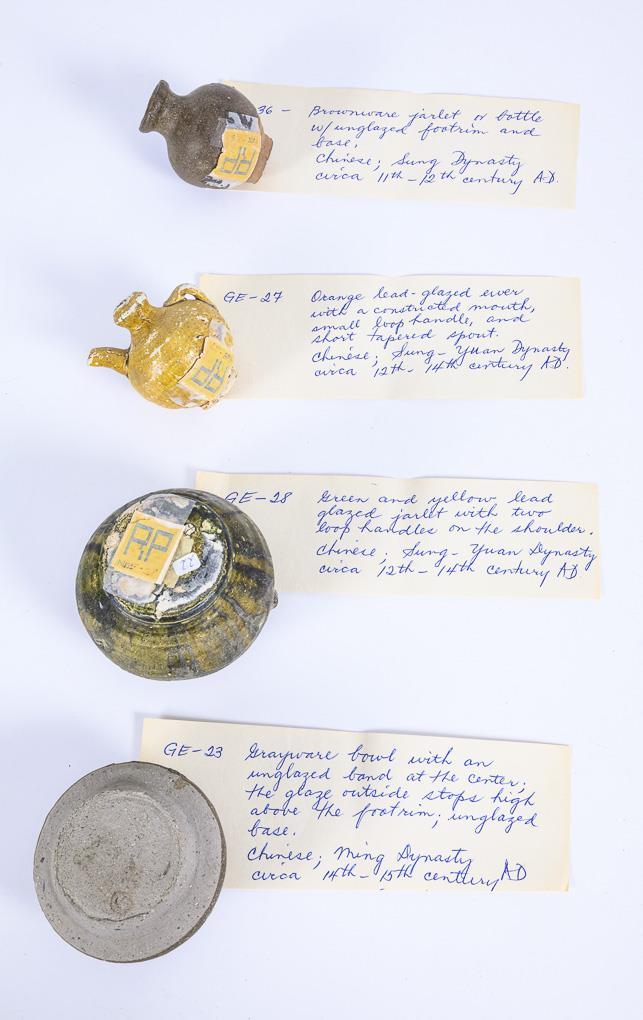 Nach den vorliegenden Beschreibungen handelt es sich um: Sawanklalok-Ware 14.-15. Jahrhundert. / Siamese (Thai) circa 14.-15. Jahrhundert. / 4 Teile China, Sung-Yuan Dynastie, 11.-14. Jahrhundert. An einem Stück fehlt ein Henkel, sonst sind die Stücke unbeschädigt, lediglich mit Altersspuren.