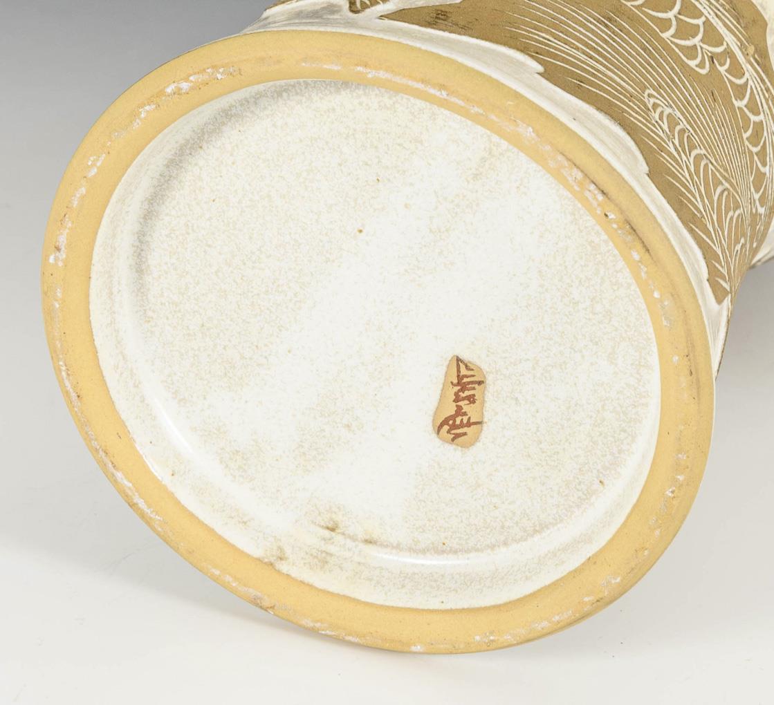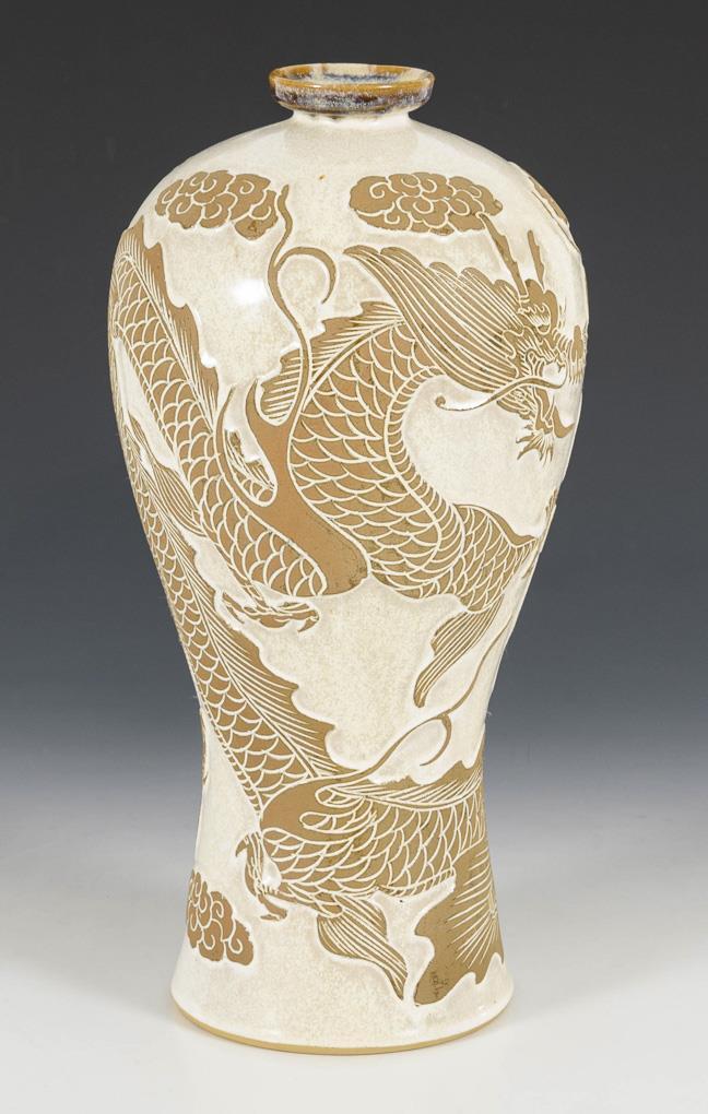 Schlanke Form mit unglasiertem Flachrelief zweier Drachen mit Kugel.