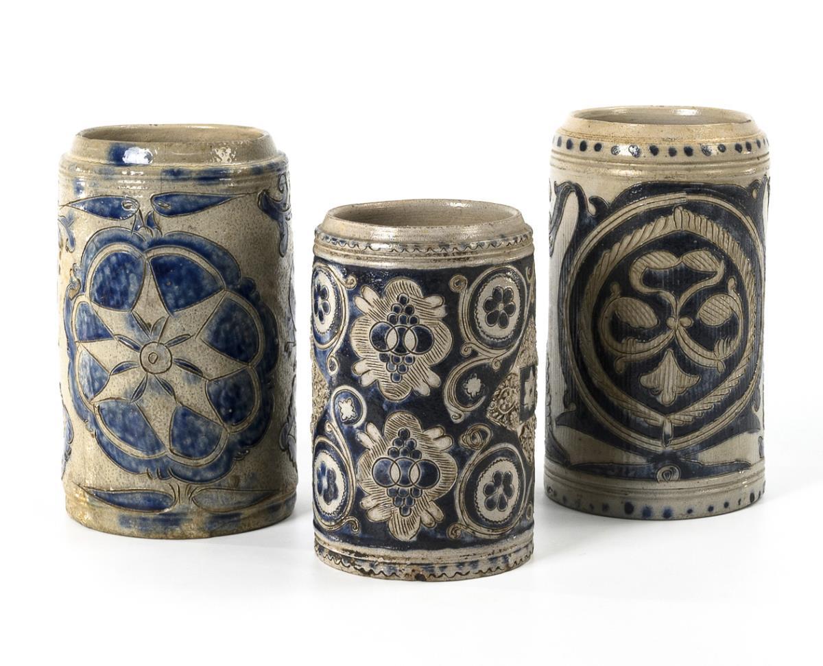 3 Westerwälder Walzenkrüge mit kunstvoller Blumenornamentik.