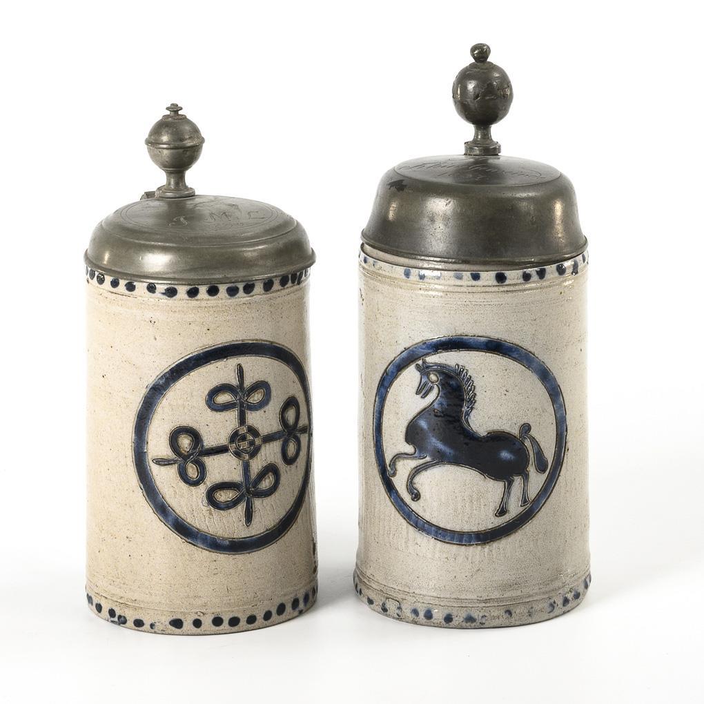 Zylinderkrüge mit glatt ausgestrichenen Ohrenhenkeln. Jeweils mit Kreisreserven, 1x springendes Pferd, 1x Kreuzblumenornament. Jeweils mit graviertem und datiertem Zinndeckel und Kugeldrücker, innen teils undeutlich gepunzt. Leichte Alters- und Gebrauchsspuren.