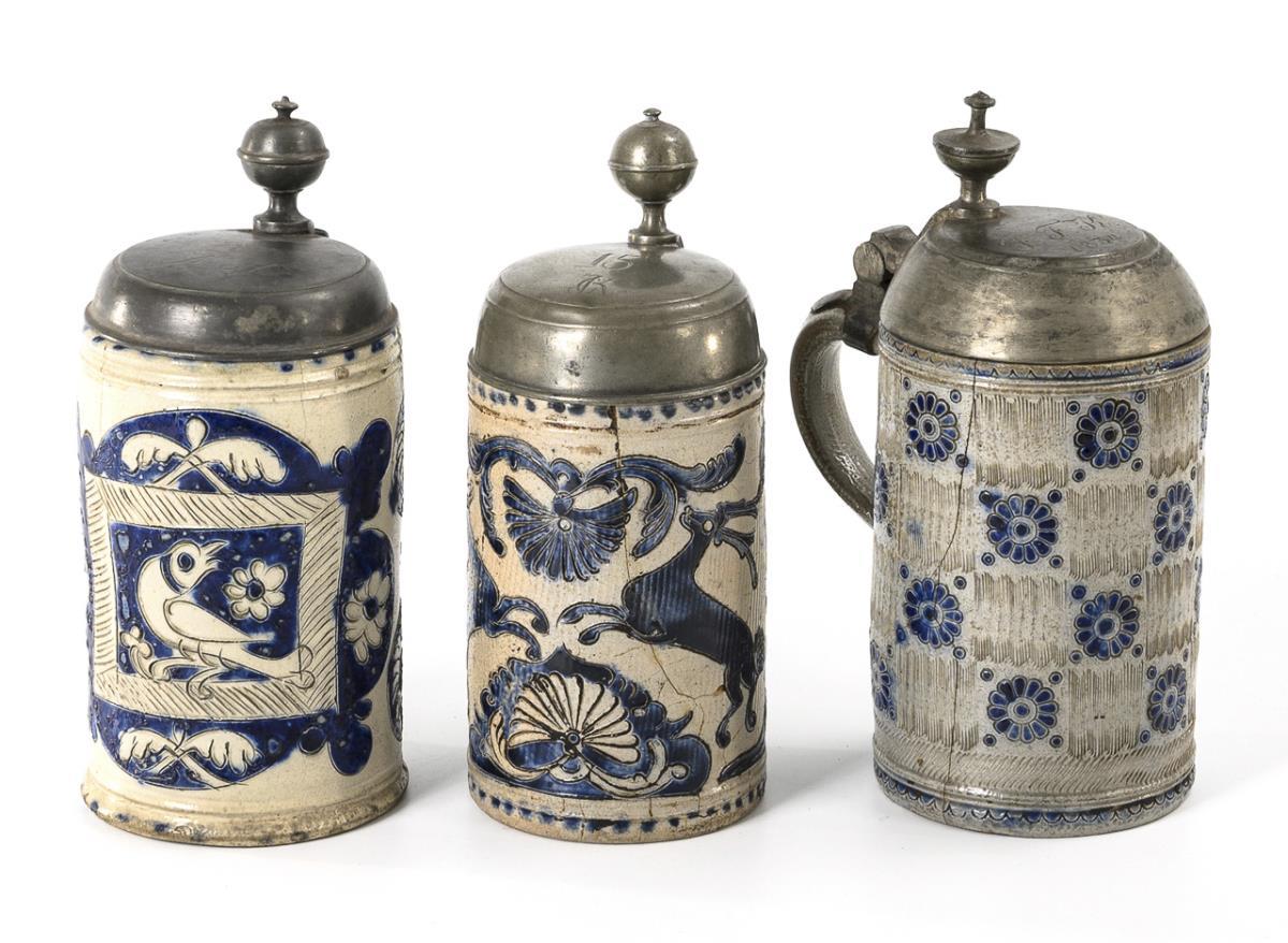Zylinderkrüge mit spitz auslaufenden Ohrenhenkeln. 1x Rechteckreserve mit Vogel und flankierenden Rosetten, 1x springende Hirsche und Fächerblattdekor, 1x Schachbrettmuster mit Rosetten und gekämmten Ritzfeldern. Jeweils mit graviertem Zinndeckel und Kugeldrücker, innen jeweils gepunzt. Mit Defekten, teils restauriert, Alters- und Gebrauchsspuren.