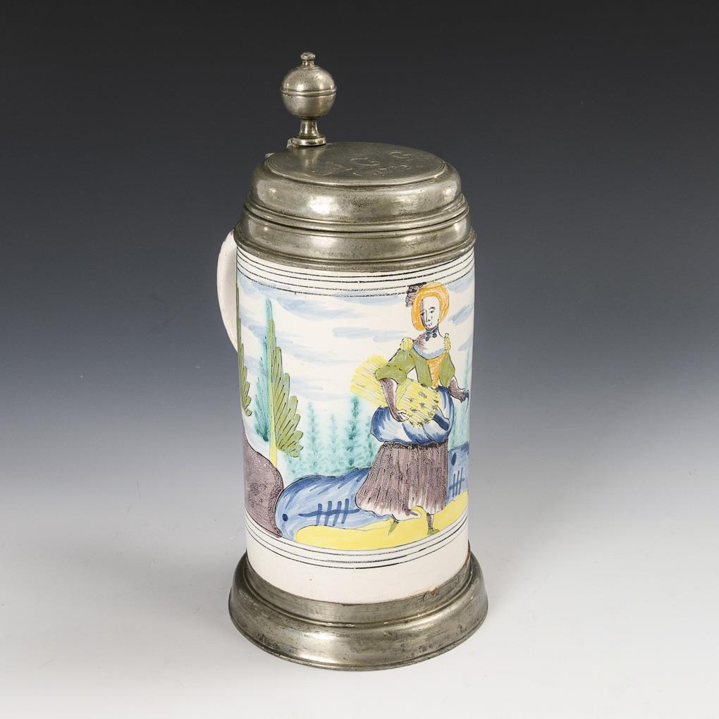 Zylindrischer Korpus mit strichverziertem Bandhenkel, schauseitig eine Bäuerin mit Ährenbündel und Sichel, flankiert von spitzen Bäumen. Zinndeckel mit Kugeldrücker, graviert und datiert "A.C.G. 1793", innen gepunzt, Zinnstand. Partiell kleine Defekte und Reparaturen am Zinn, Zinnstand lose.