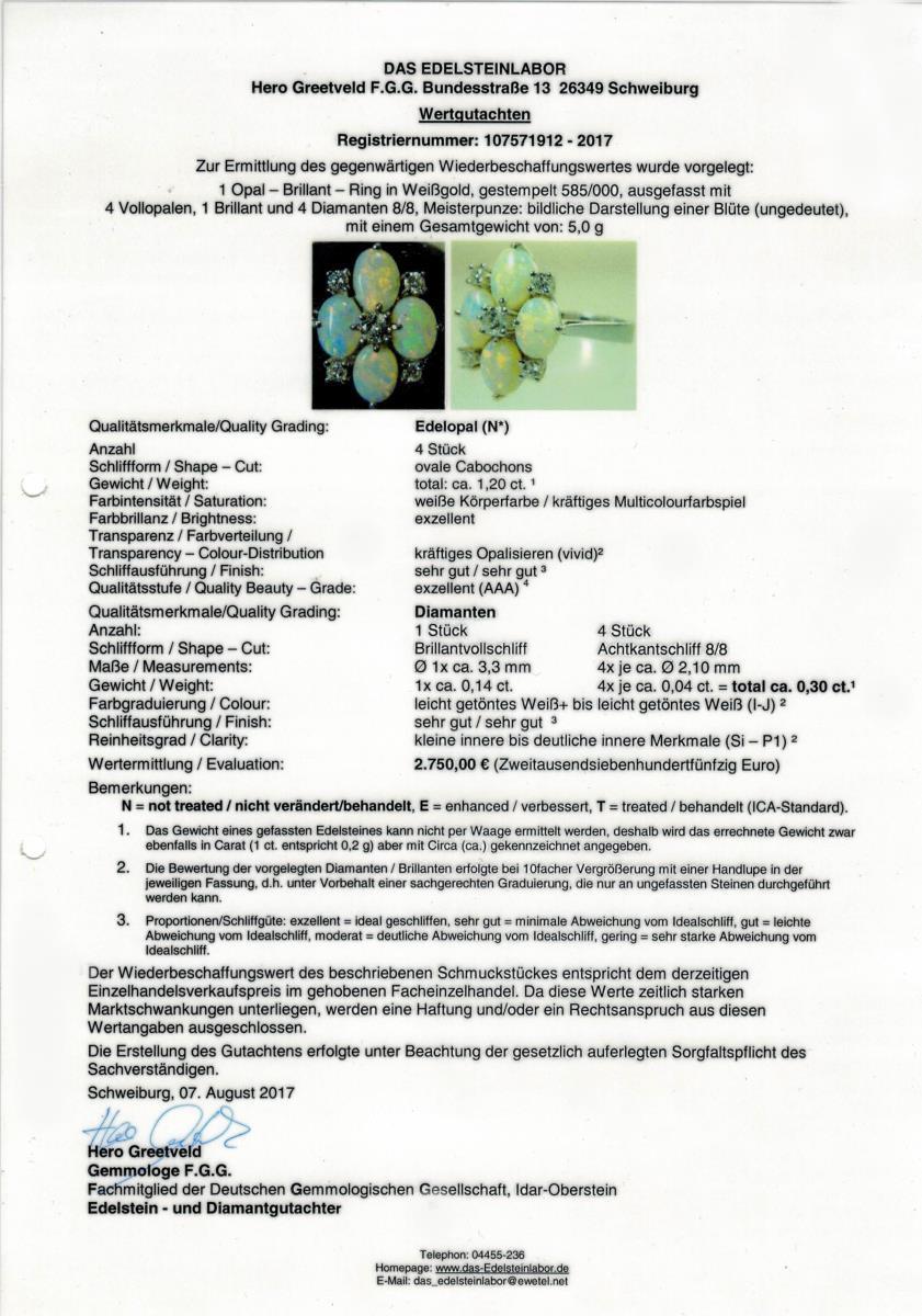 Weißgold 585 gestempelt. Opale zus. ca. 1,20 ct. Brillant ca. 0,14 ct. 8/8 Diamanten zus. ca. 0,30 ct/I-J/si-PI. Ringgröße 57. 5,0 g.