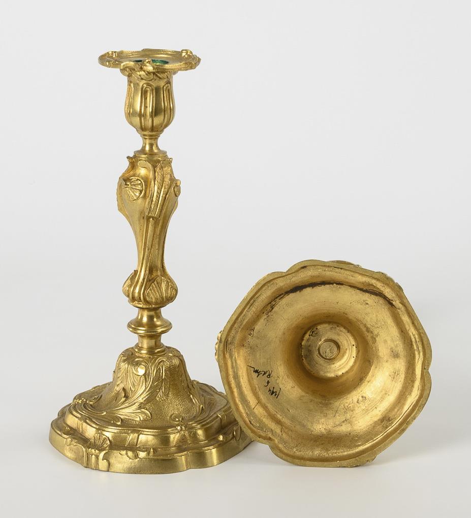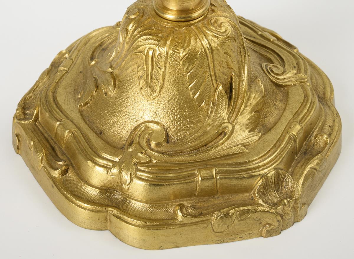 Bronzeleuchter im Rokoko-Stil mit vegetabilem Relief am passigen Rundfuß, Balusterschaft und an der Vasentülle.