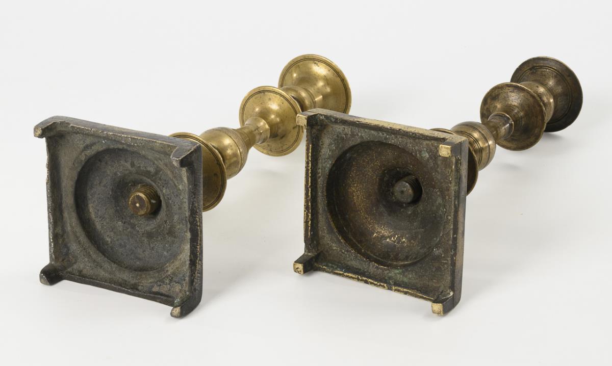 Schwere, einander sehr ähnliche Bronzeleuchter mit großen Scheibenwirteln am Balusterschaft und Vasentülle. 1 Fuß mit unauffälligen Gussfehlern und Resten einer Versilberung, je Alters-/Gebrauchsspuren.