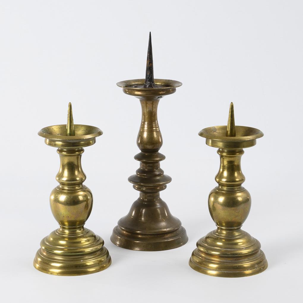 Paar massive Bronzeleuchter in gedrungener Balusterform mit Bronzedorn in der Tropfschale. / Schwerer Leuchter mit hohem Fuß, breit gewirteltem Balusterschaft und Tropfschale mit eingenietetem Eisenblech als Halterung für den Eisendorn. Verbindung Bronzedorne nachgelötet. Einzelleuchter Haarriss am Schaft, sonst minimale Alters-/Gebrauchsspuren.