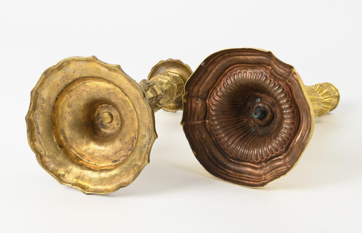 Je passiger Rundfuß und Balusterschaft. Gerippter Schaftansatz und Schaft mit Verdrehung bzw. schwerer Leuchter mit reich ornamental reliefiertem Schaft sowie Tülle mit Wachsteller.