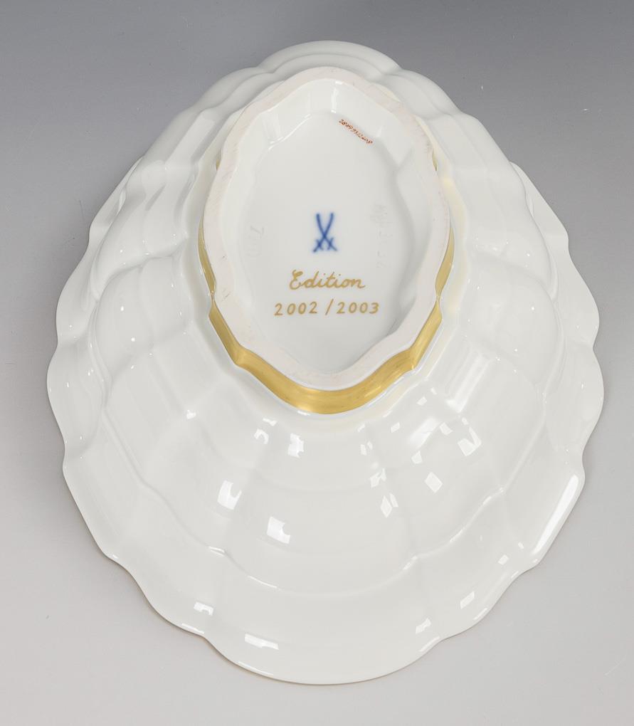 Ovale, mehrpassige Schale, im Spiegel die Darstellung eines Harlekins mit Hund.