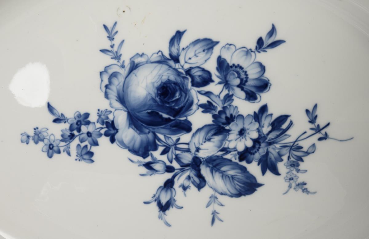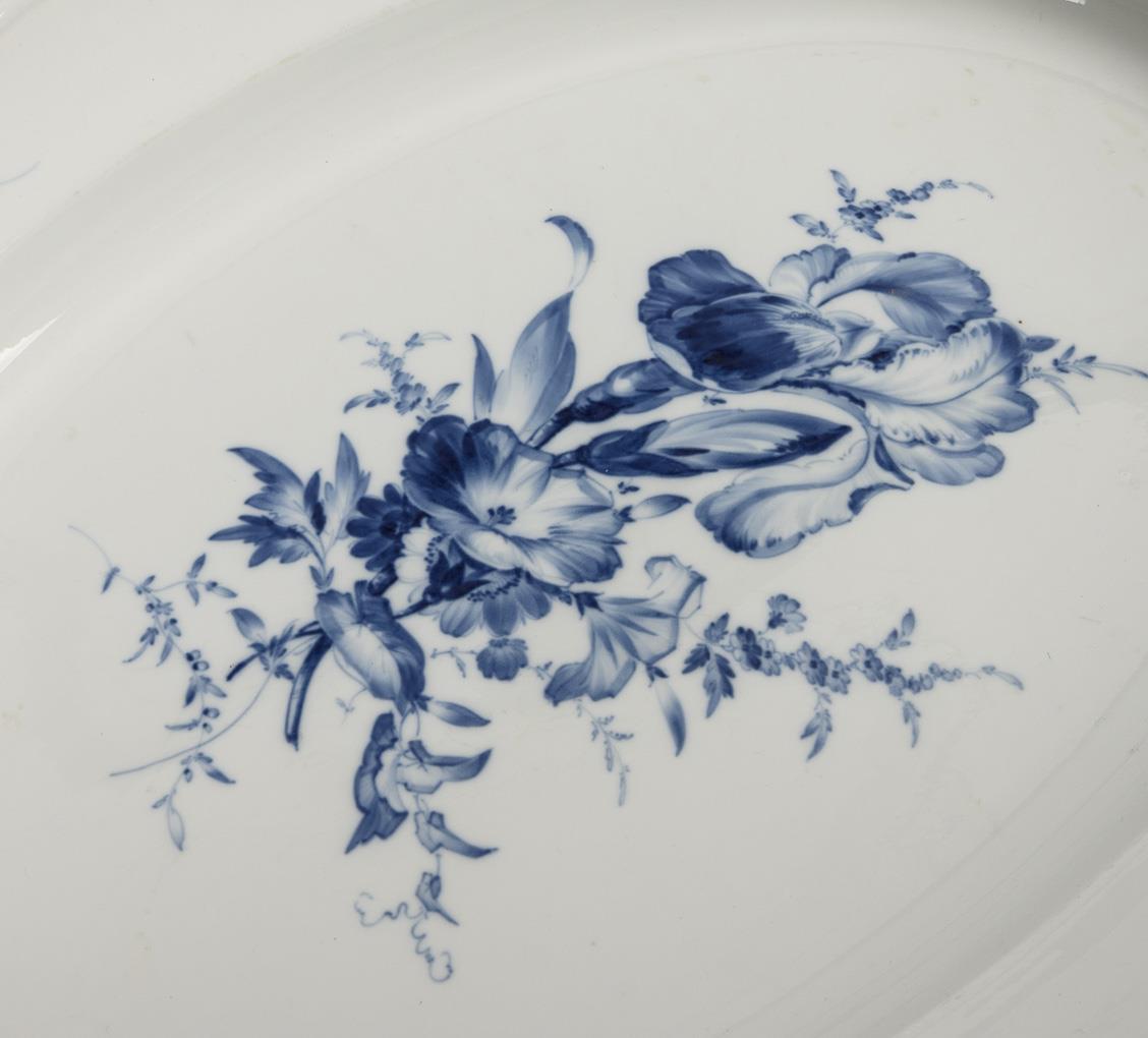 Unterglasurblaue Blumen- und Insektenmalerei. Presentoir (L 49,5 cm) und Ovalplatte (L 53 cm).