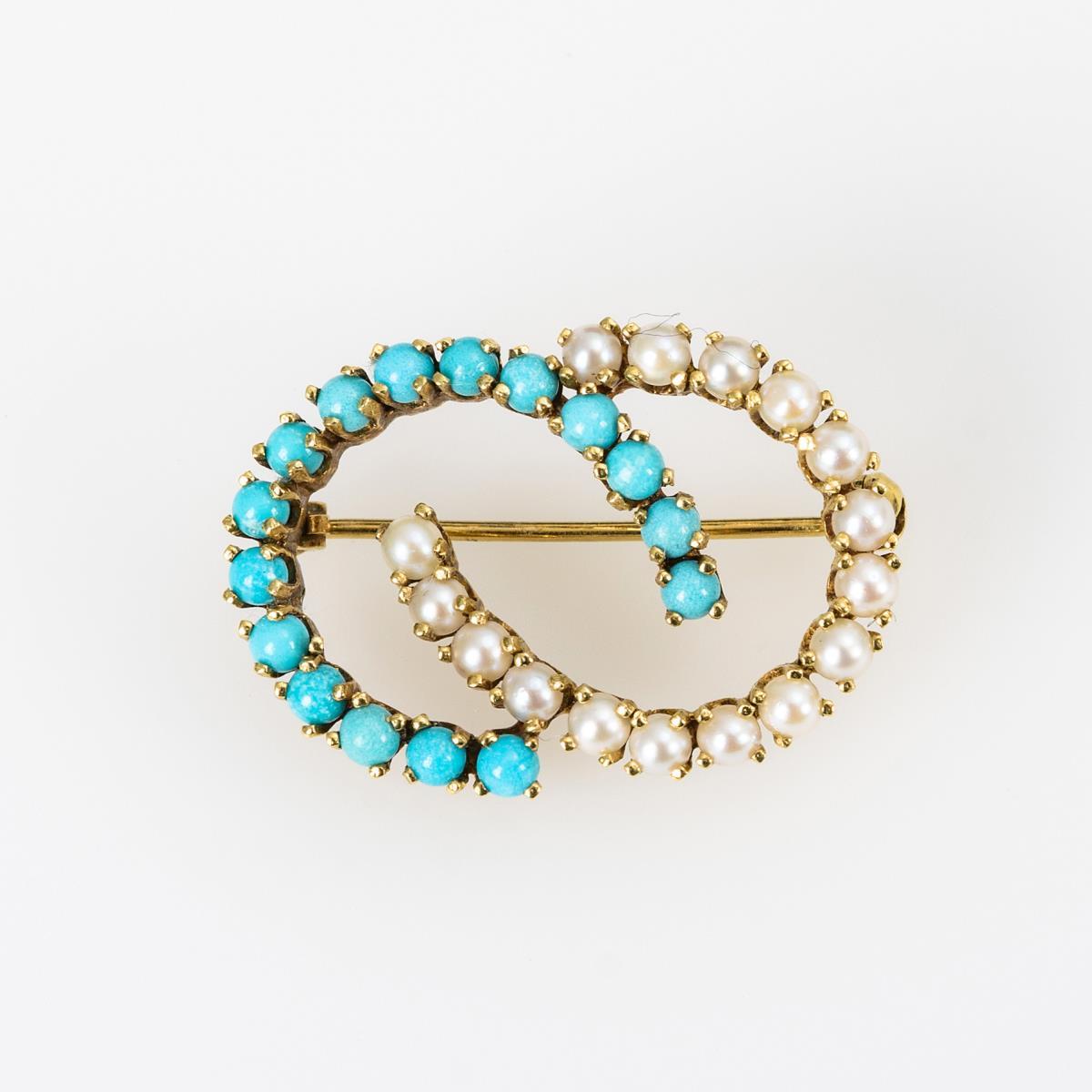 Brosche mit Türkisen und Perlchen.