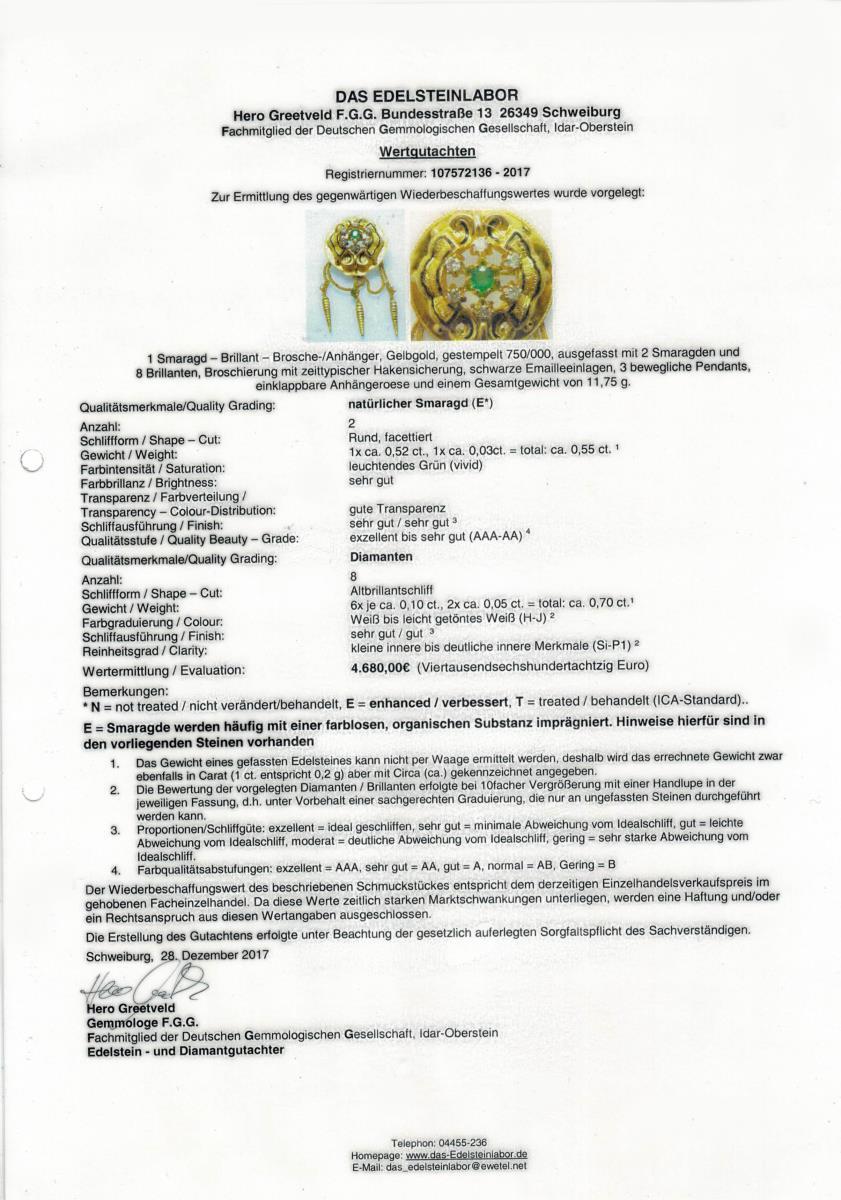 Stiltypische Brosche mit 8 chatongefassten Brillanten, 2 Smaragden, Ketten- und Pendelabhängungen. Hakenverschluss, kleine Ringöse.
