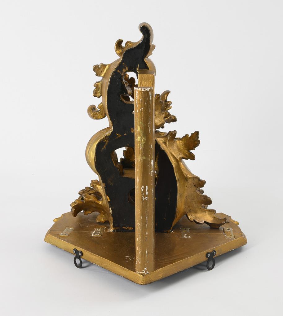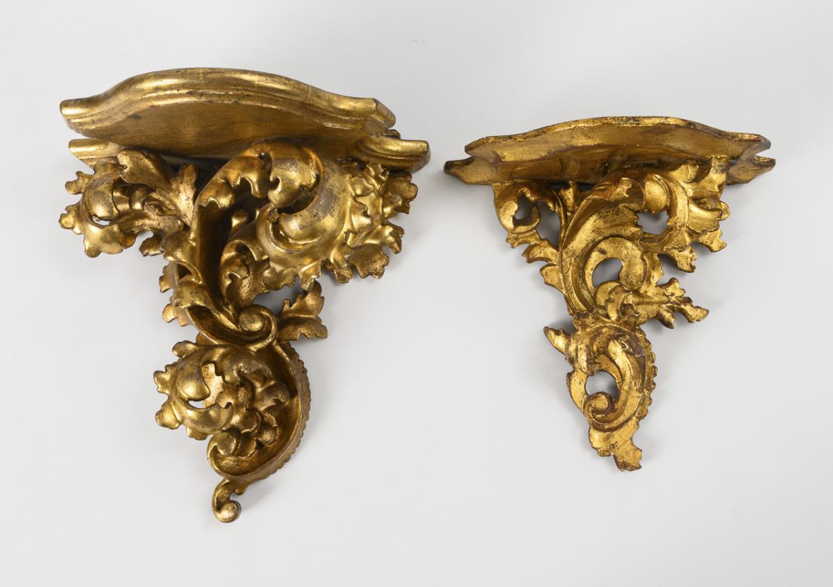 Je mit verspielten Akanthusranken und geschweiften Deckplatten. Große Stuckkonsole mit Vergoldung nachträglich zu Eckkonsole erweitert. Die kleineren je geschnitzt. Teils minimale Abplatzer, einige Alters-/Gebrauchsspuren, teils überbronziert.