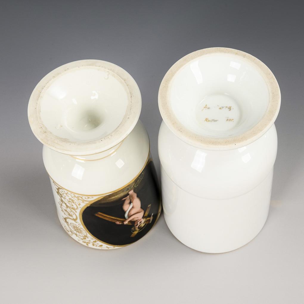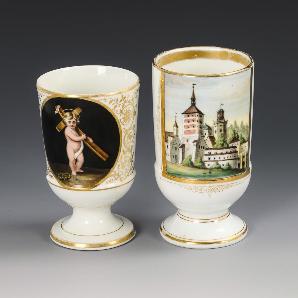 1x Kakaobecher mit der schauseitigen Ansicht des Roten Tores in Augsburg. / 1x Kakaobecher mit der Darstellung des kreuztragenden Johannesknaben in einem schauseitigen Medaillon. Gold etwas berieben.