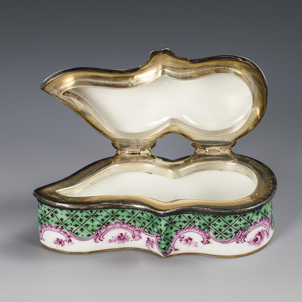 Unregelmäßig geformte Dose mit silbermontiertem Scharnierdeckel (ungepunzt, Silber geprüft). Auf dem Deckel die purpurgemalte Darstellung zweier Jäger mit zwei Hunden, auf der Wandung grüne Mosaikbordüre mit Purpurrocaillen.