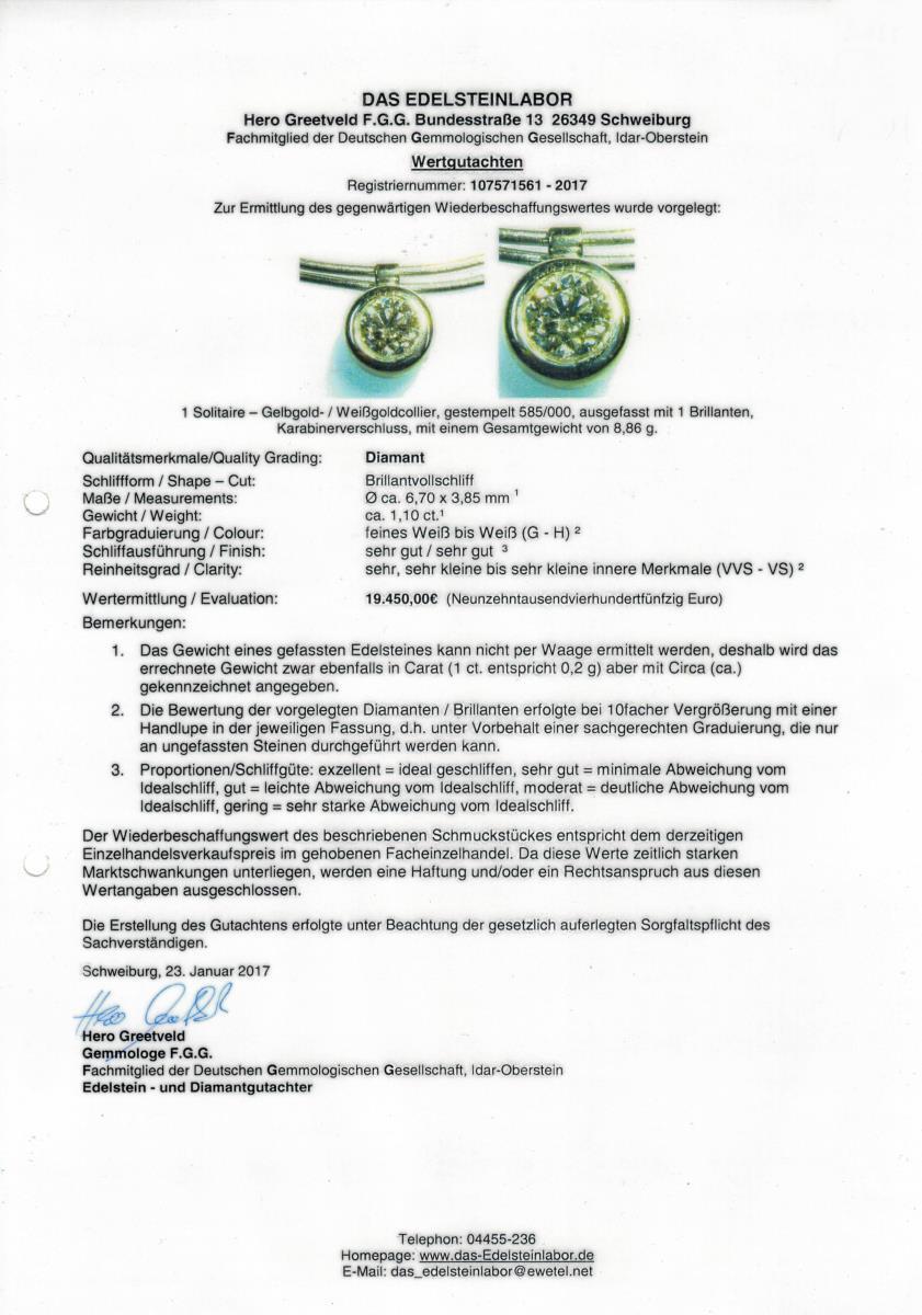 Weißgold 585 gestempelt. Brillant ca. 1,10 ct/G-H/vvs-vs. L 42,5 cm. 8,86 g.