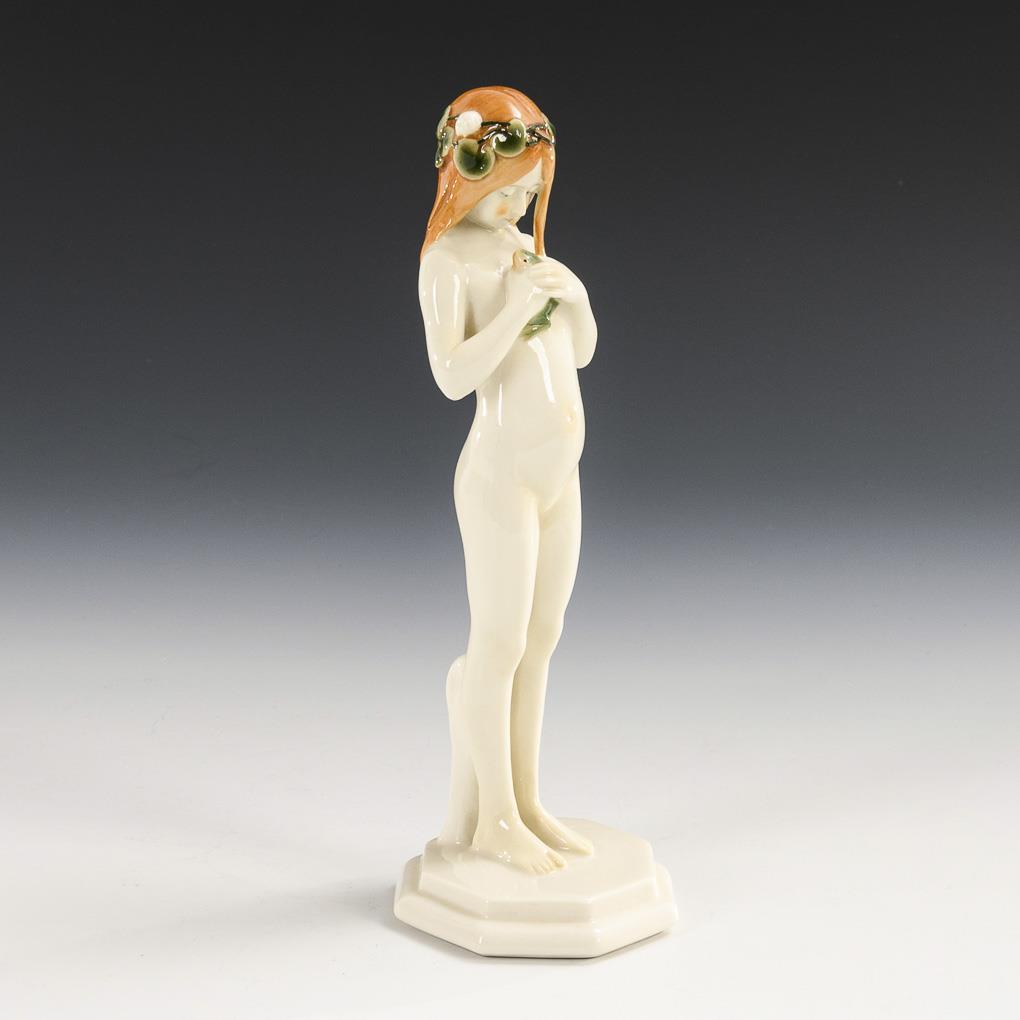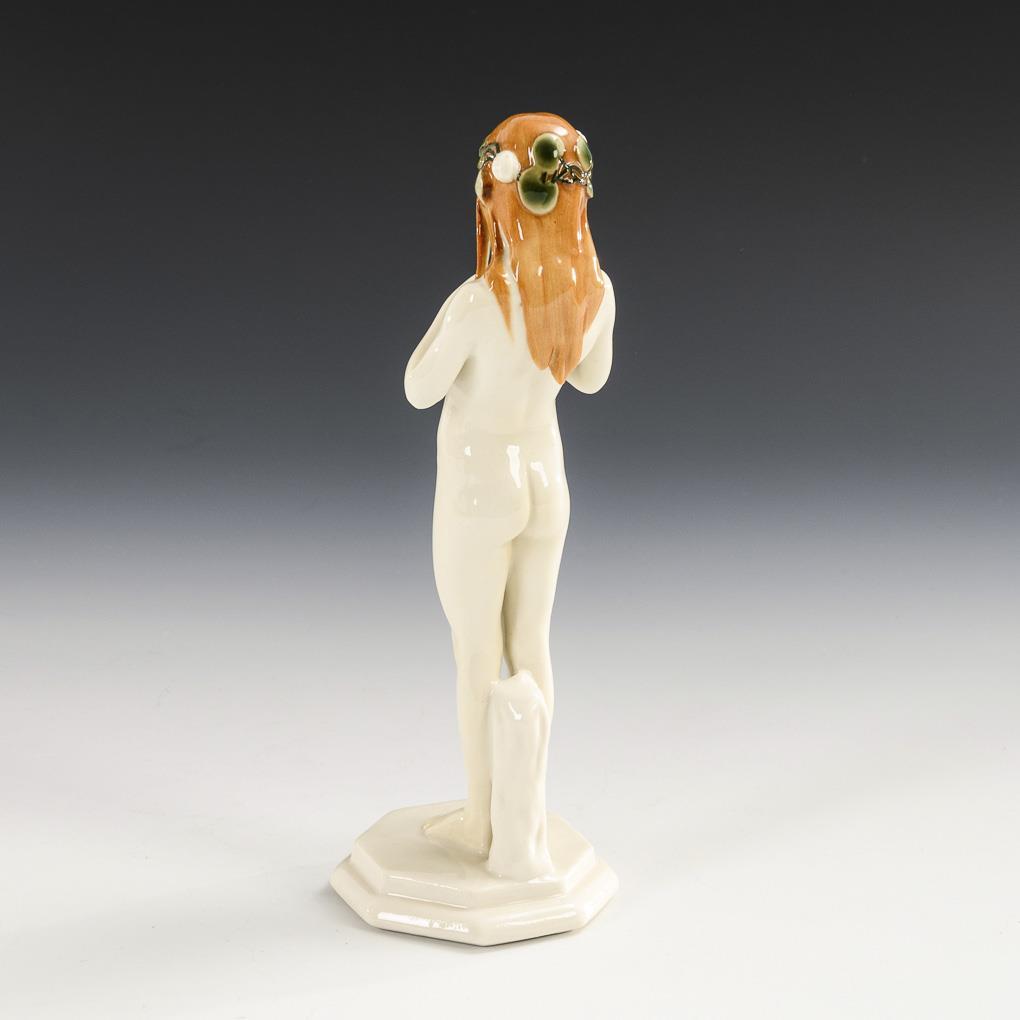 Stehendes, einen Frosch haltendes Mädchen mit Seerosenblättern im Haar. Aufsatzfigur einer Tischschale.