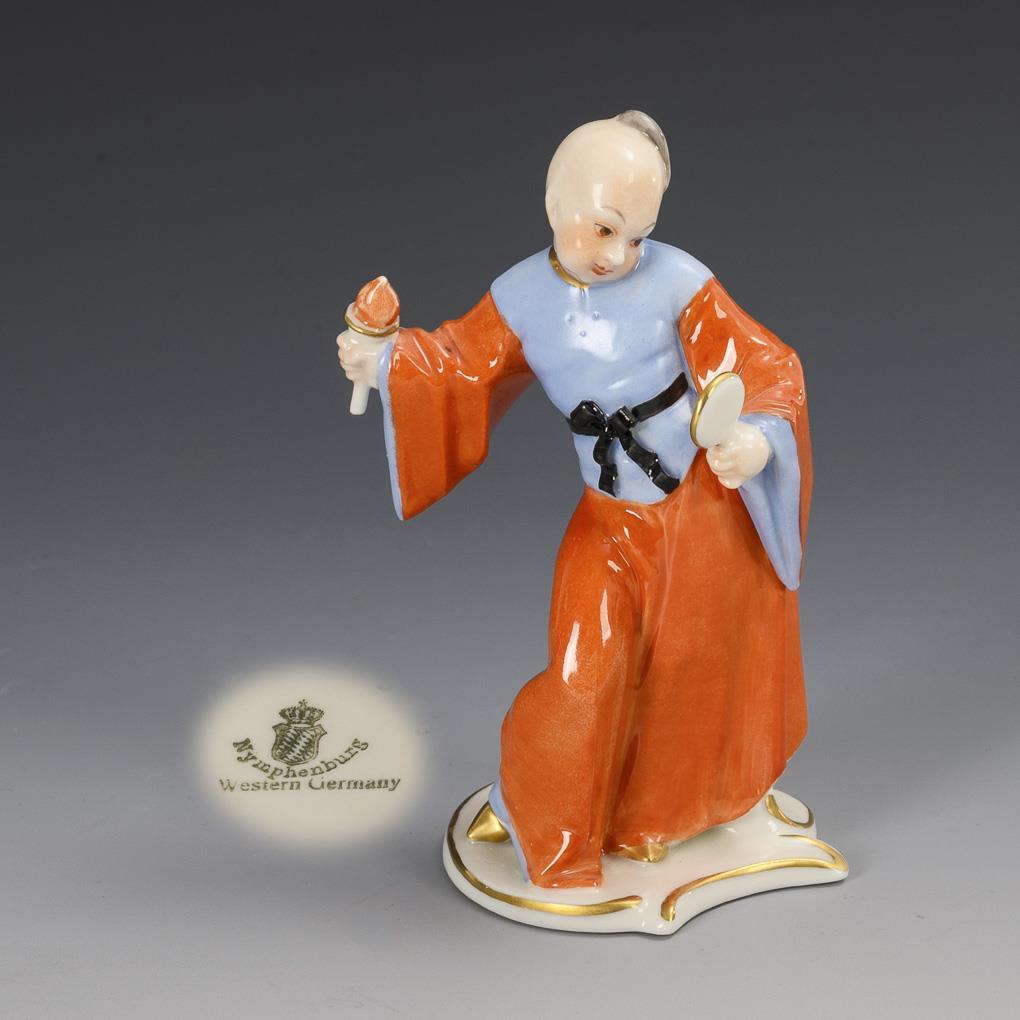 Auf einer Rocailleplinthe stehendes Chinesenkind mit Spiegel und Fackel.