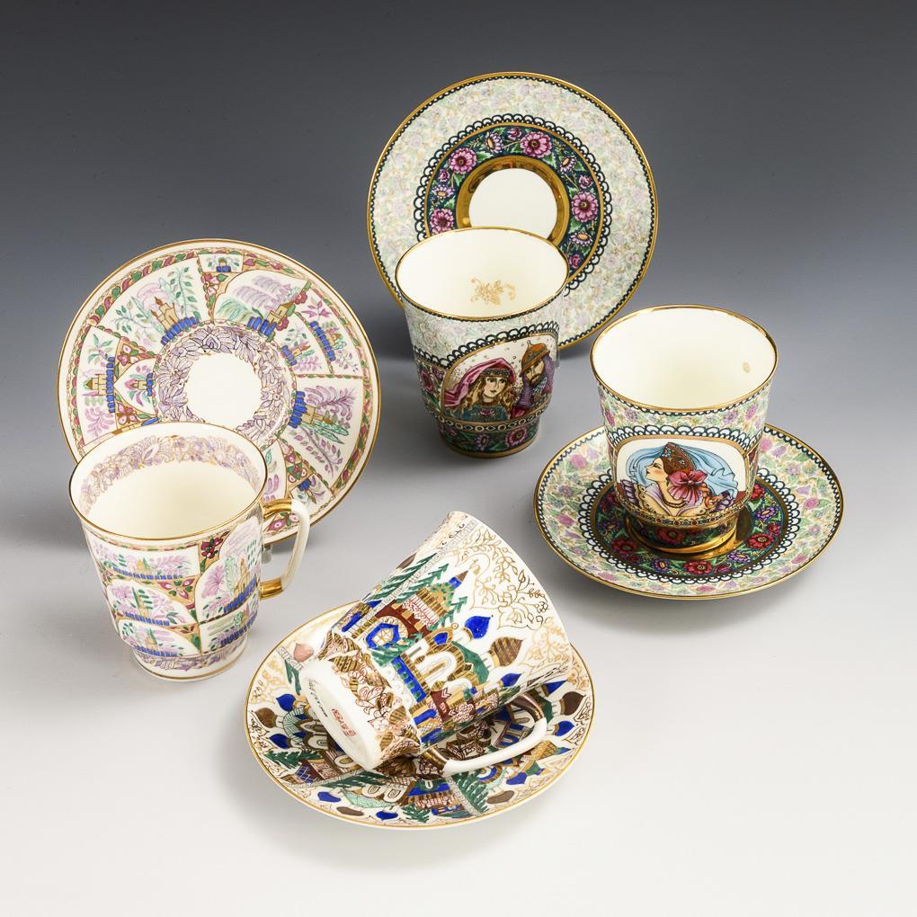 Polychrom bemalt, goldstaffiert. 4 Tassen (H 7,5 cm). 4 Untertassen (Ø 12 cm).