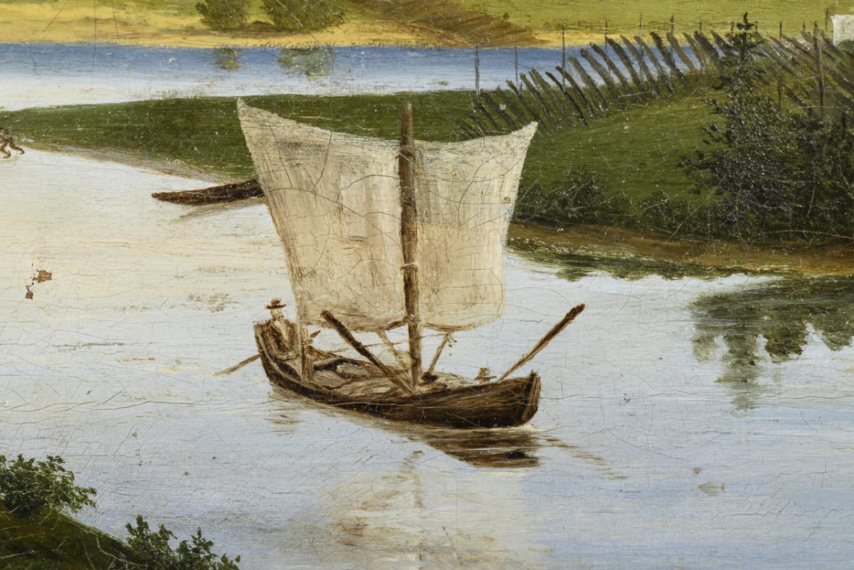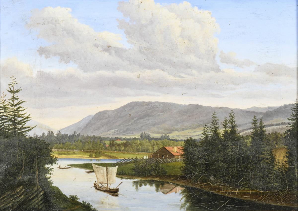Bergige Landschaft mit Booten an einer Flussbiegung vor dem Bergrücken am Horizont. Altersspuren, kleine Bestoßungen.